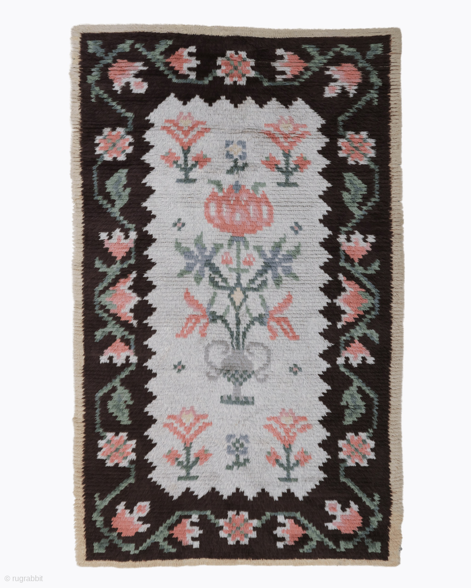 The design features a central floral bouquet in a vase, framed by stylized blossoms along the borders. Executed in soft hues of pastel pink, green, blue, and chocolate brown, the rug reflects the timeless harmony and understated elegance of Swedish design.