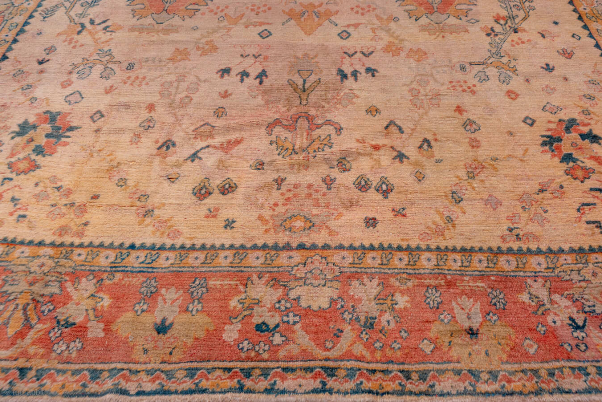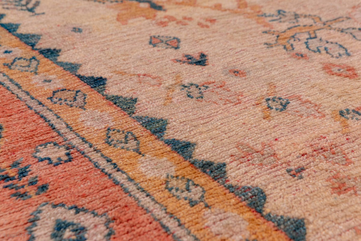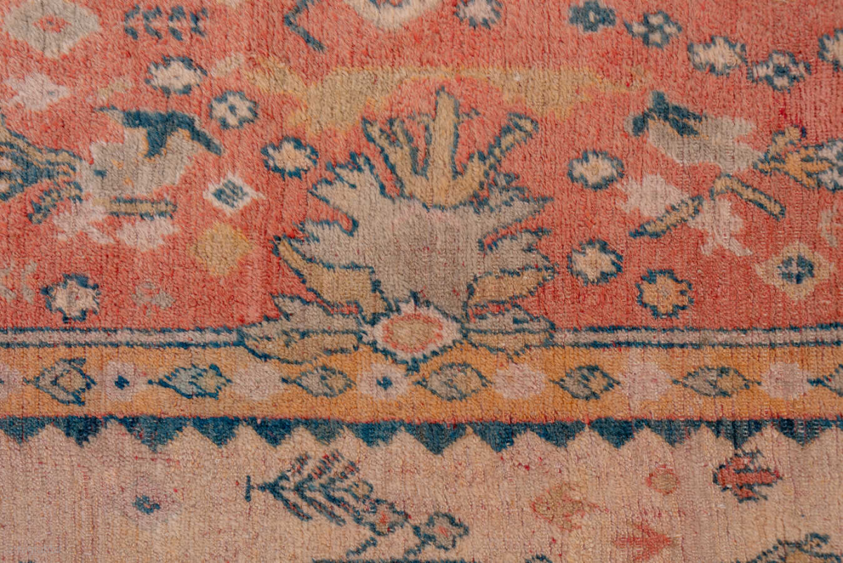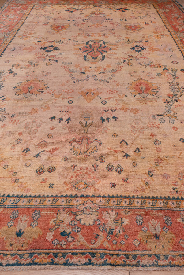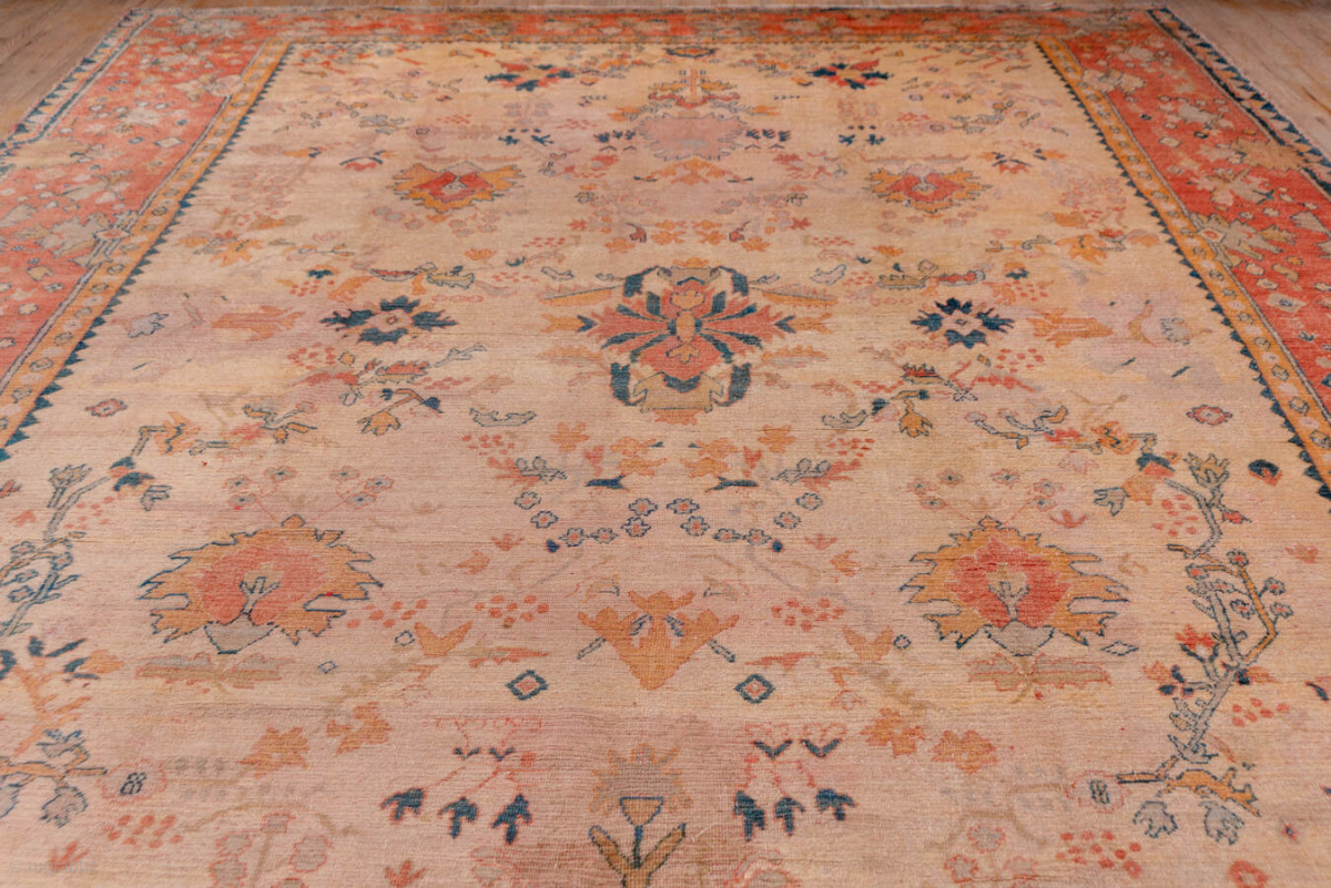 This magnificent large-scale antique Oushak rug features a serene and graceful composition typical of early 20th-century Western Turkish weaving. The soft coral field hosts a loosely drawn floral medallion pattern rendered in delicate tones of pale gold, rose, ivory, and deep indigo. Subtle abrash variations add visual depth and a painterly quality, while the border—woven in a harmonious terracotta tone—frames the design beautifully. The combination of fluid, organic motifs and luminous color gives this piece a tranquil yet refined presence. Handwoven with lustrous wool, it embodies the relaxed elegance and artistry that make Oushak rugs perennial favorites among collectors and interior designers alike.