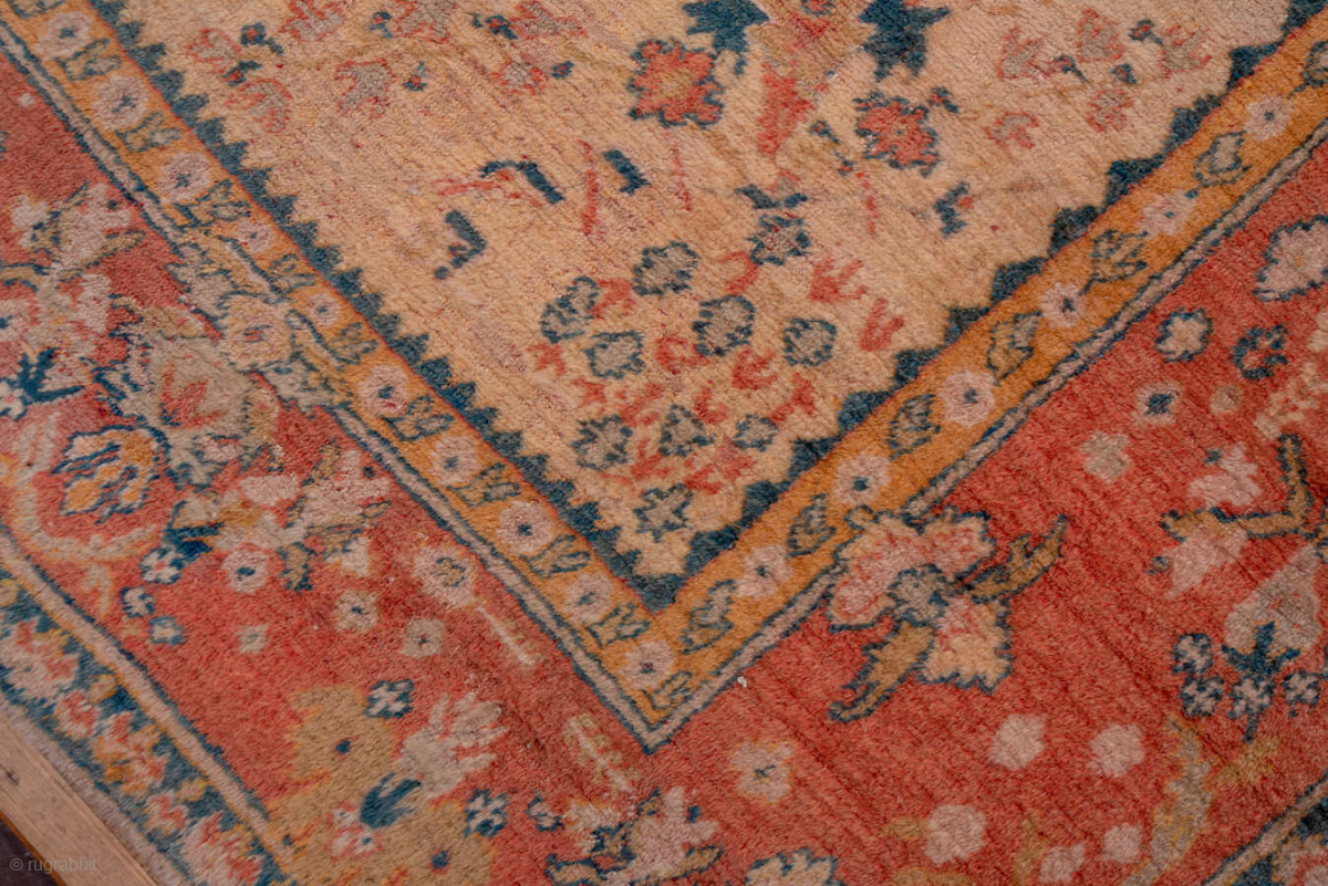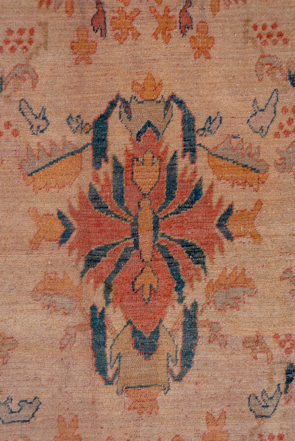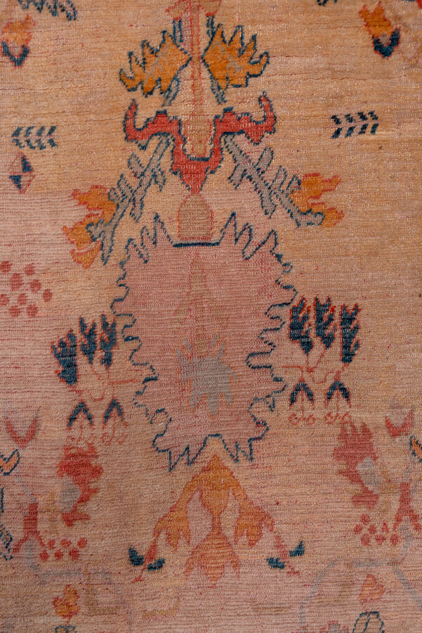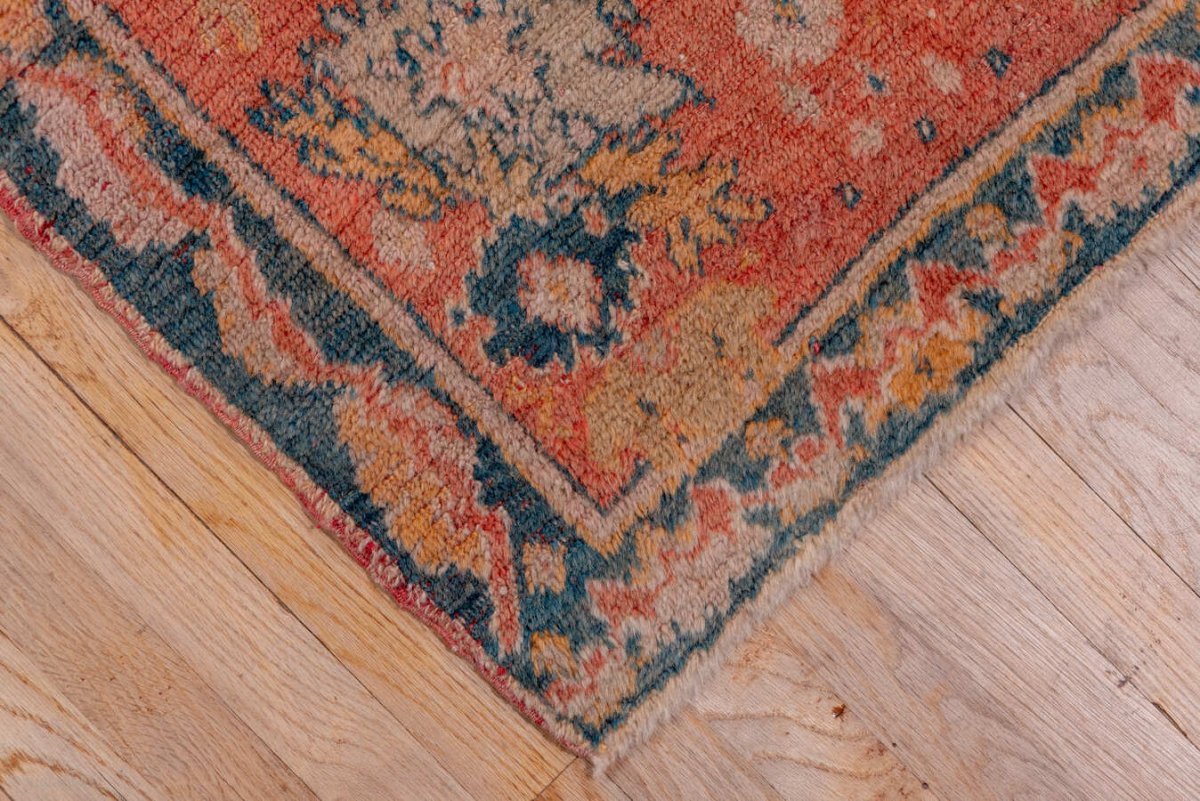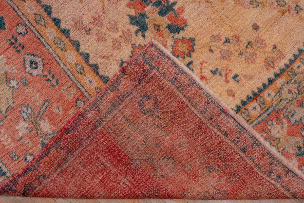 This magnificent large-scale antique Oushak rug features a serene and graceful composition typical of early 20th-century Western Turkish weaving. The soft coral field hosts a loosely drawn floral medallion pattern rendered in delicate tones of pale gold, rose, ivory, and deep indigo. Subtle abrash variations add visual depth and a painterly quality, while the border—woven in a harmonious terracotta tone—frames the design beautifully. The combination of fluid, organic motifs and luminous color gives this piece a tranquil yet refined presence. Handwoven with lustrous wool, it embodies the relaxed elegance and artistry that make Oushak rugs perennial favorites among collectors and interior designers alike.