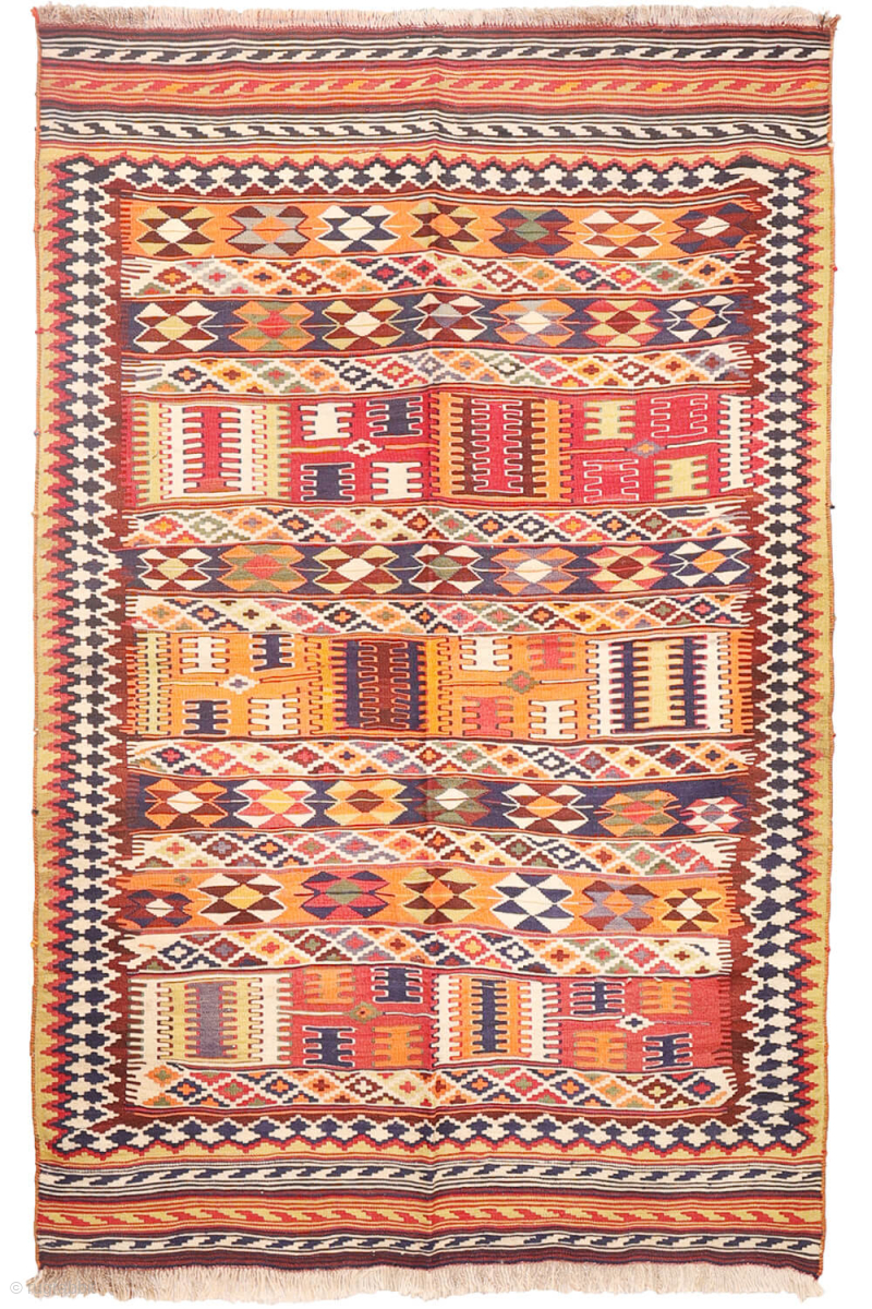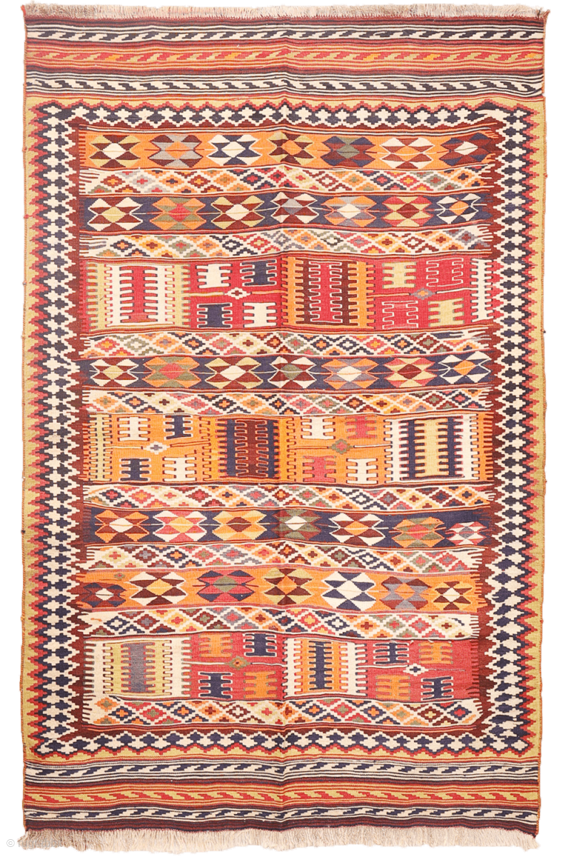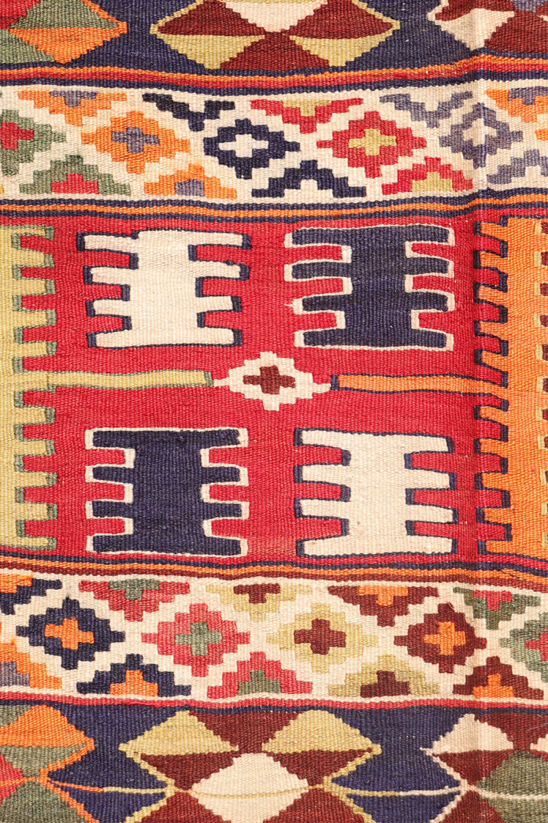 This Qashqai kilim features a horizontal layout made up of bands of varying widths. Within these bands, the weaver incorporated a variety of traditional motifs — most notably the “comb” motif, often seen as a symbol of purity.