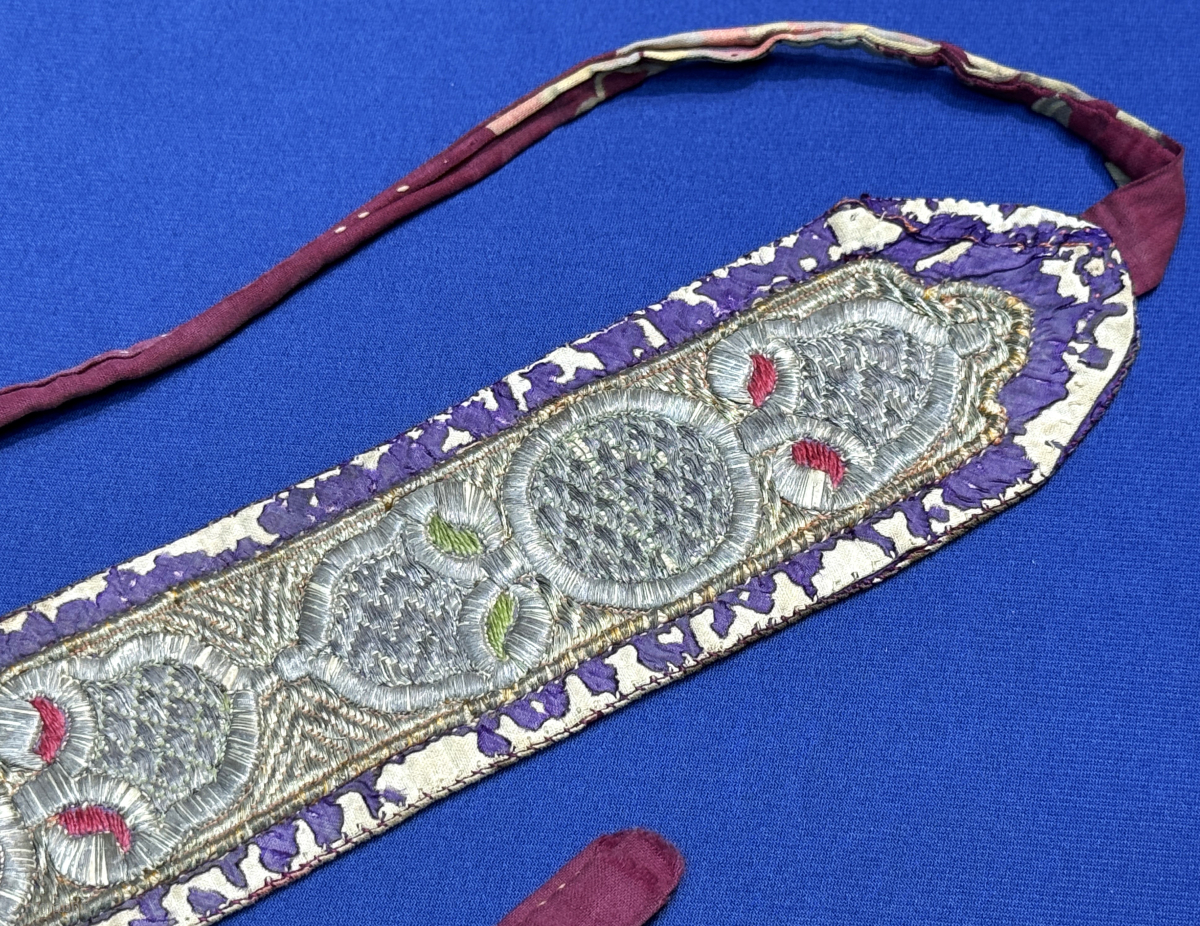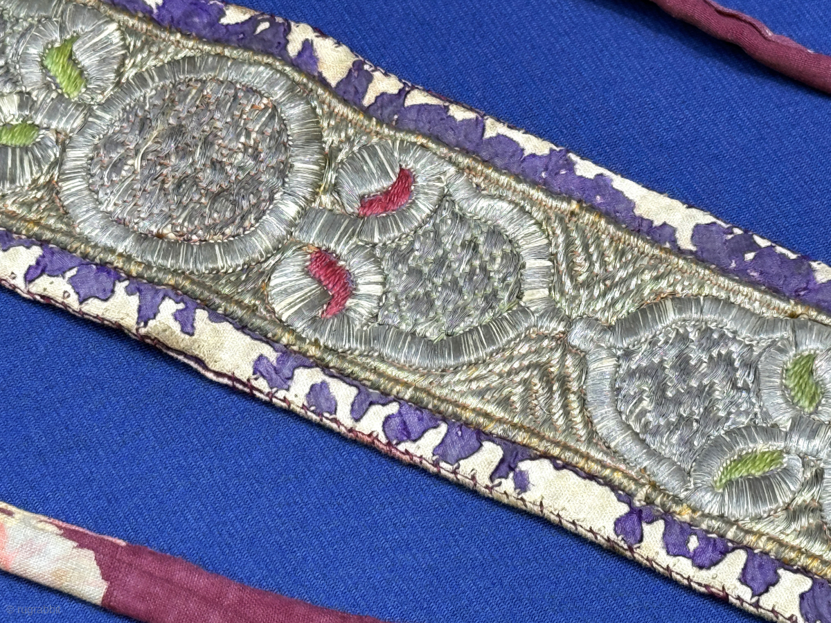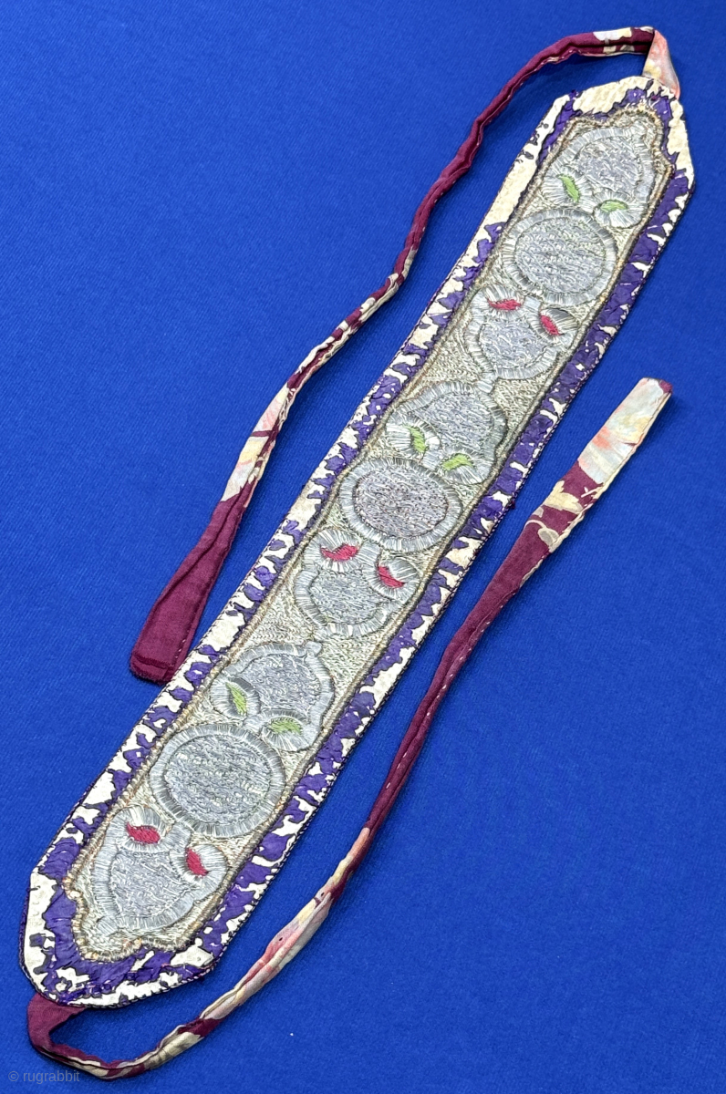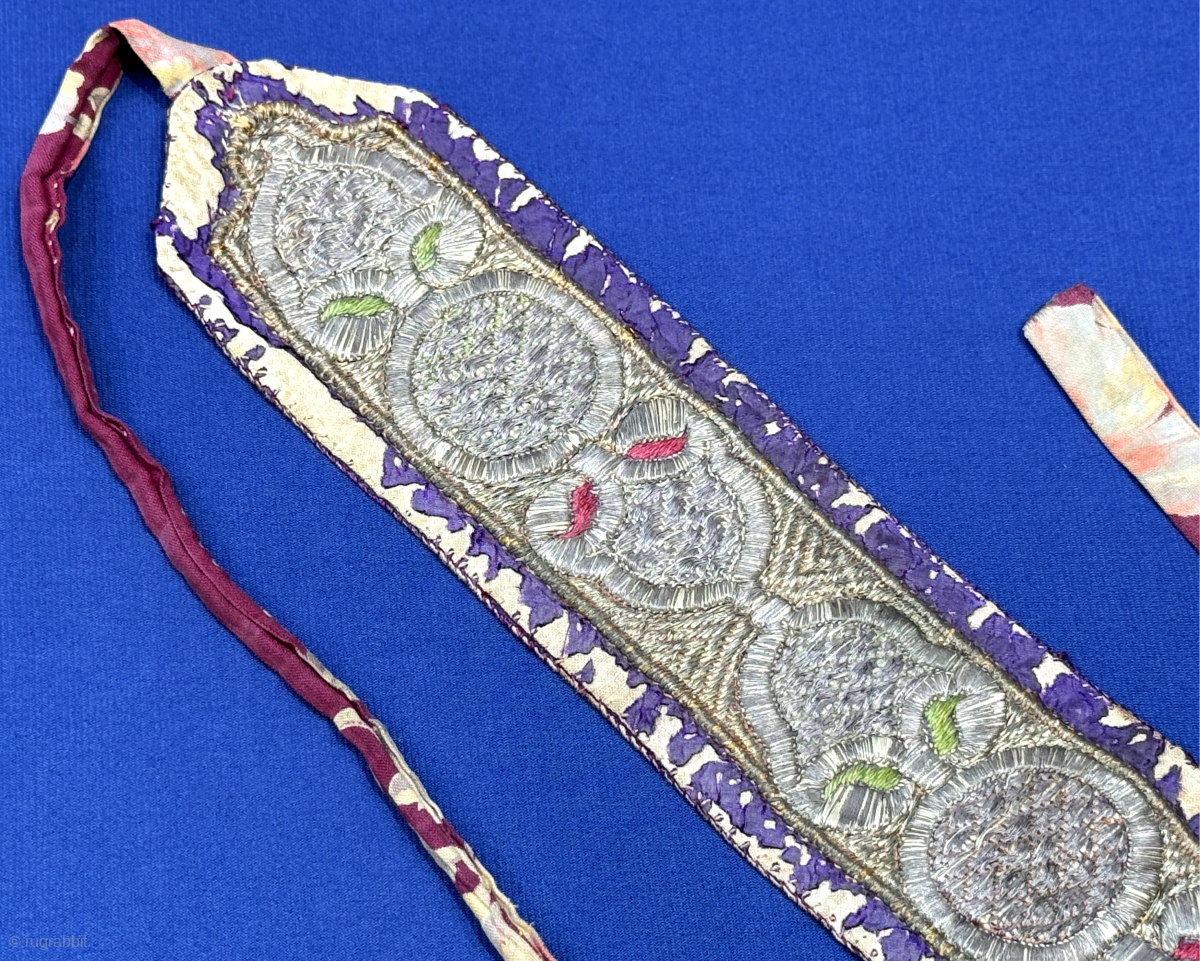Antique Bokhara ceremonial silk and metallic embroidered headband. Circa - 1900s. Size - 16'' x 2.5'' - ''41.5 cm x 6.3 cm'' turkmansilver@gmail.com.