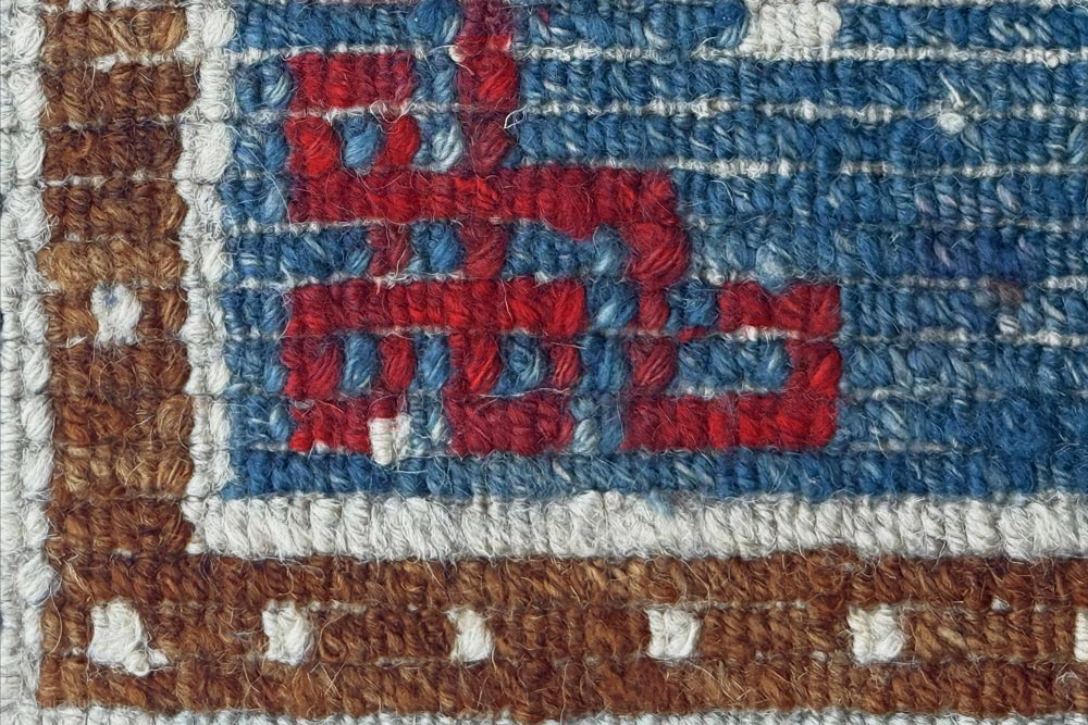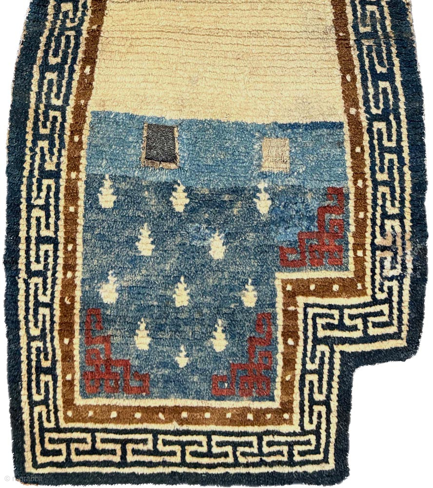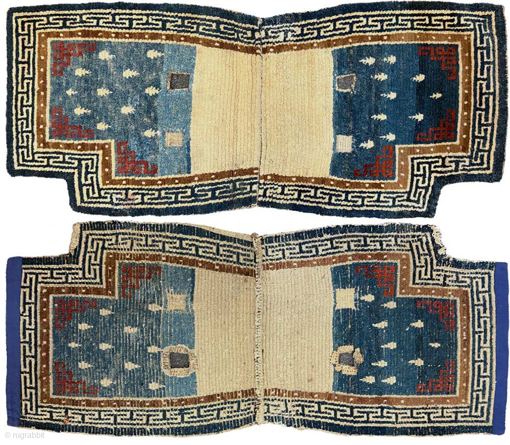 Tibetan under saddle carpet (makden) from the 1800’s / 19th century with the so-called ‘frog-foot’ motif scattered sparingly throughout the main field, an inner border of pearls and an outer border with a simple t meander design. All the colours used throughout the carpet are from natural dyes, with the rich red of the corner design being super saturated and the several shades of blue – ranging from solid darker blue to various shades of lighter abrashed blue – being from indigo. The warp and the weft (and pile) are all hand spun wool, the size is 131cm x 57cm (approximately 52in x 22in) and while there are a three smallish reweaves in the border of the carpet overall it is in good condition for its age. For more photos and information please see https://warpandweft.club/portfolio-item/makden-item-31/