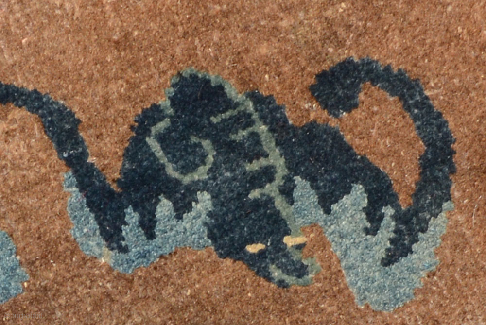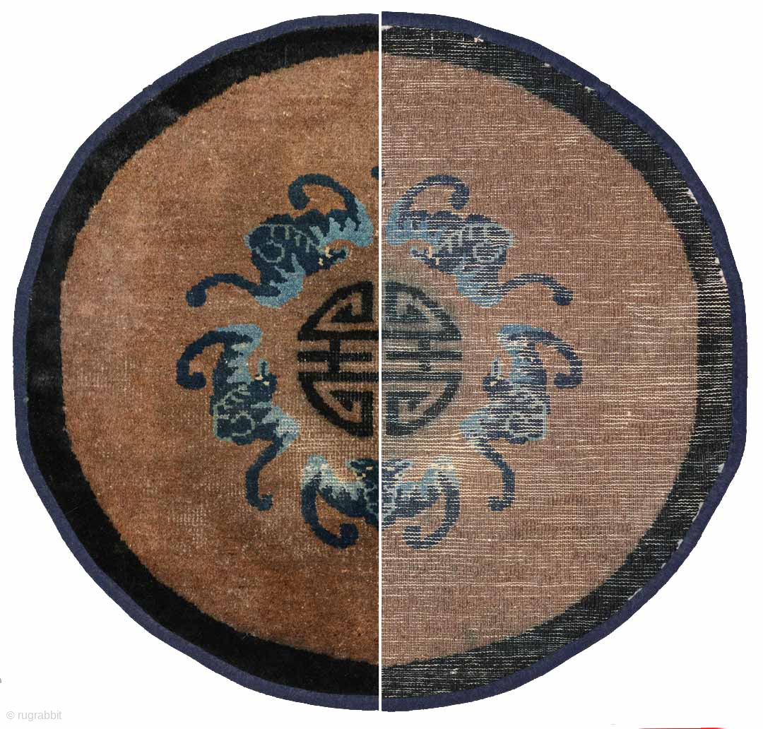 Small auspiciously designed circular rug from Inner Mongolia, i.e. the Baotou / Suiyuan region of China. The design features the central Shou symbol - the Chinese symbol of longevity - surrounded by a circle of five bats, the ‘Wu Fu’ or ‘five blessings’ and an outer dark blue border. It was made towards the end of Qing Dynasty, that is circa 1900, the main field is undyed natural brown wool, the warp and weft are cotton and the diameter is +/- 74cm (approximately 29in). The pile is worn in parts as seen in the photo, but the carpet is stable and has no repairs, and has been edged with a thin strip of blue cotton cloth to protect the edges from any unraveling / fraying. It is a ‘complete’ carpet, that is it was made ‘as is’ and not a fragment of a larger carpet. For more photos and information please see https://warpandweft.club/portfolio-item/baotou-suiyuan-item-5/