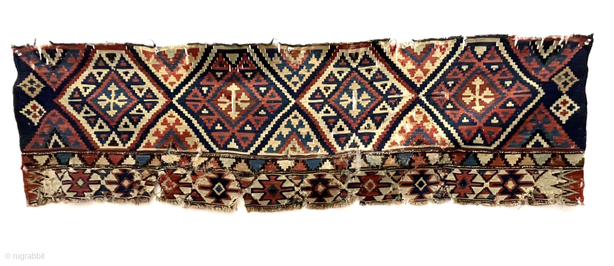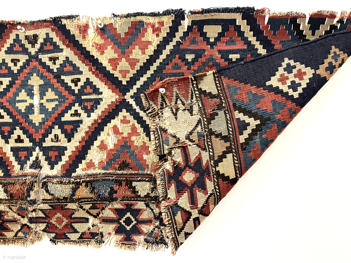Textile bin clean out. Shirvan kelim fragment. Good age. Rough edges.