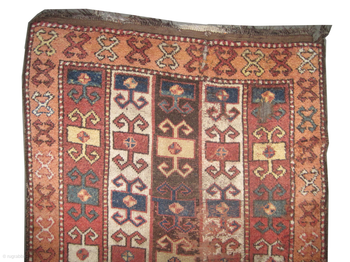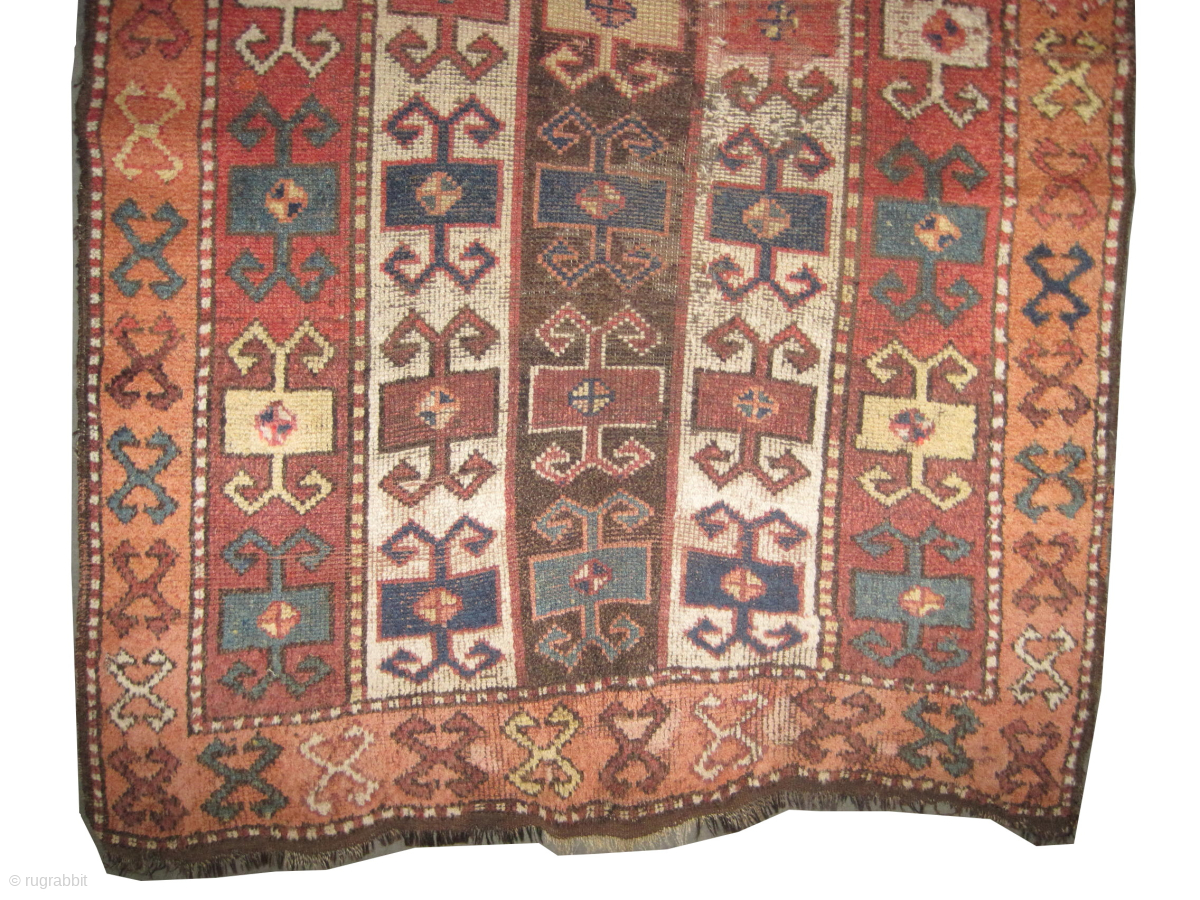 Vegetable dyes, the brown knots are oxidized. The knots, the warp and the weft threads are mixed with hand spun lamb wool and goat hair. Both edges are finished with 4cm kelim, the salvages are woven on two lines with goat hair, all over geometric rare design, high pile, certain places are with damages, soft as an handkerchief, in its original shape.