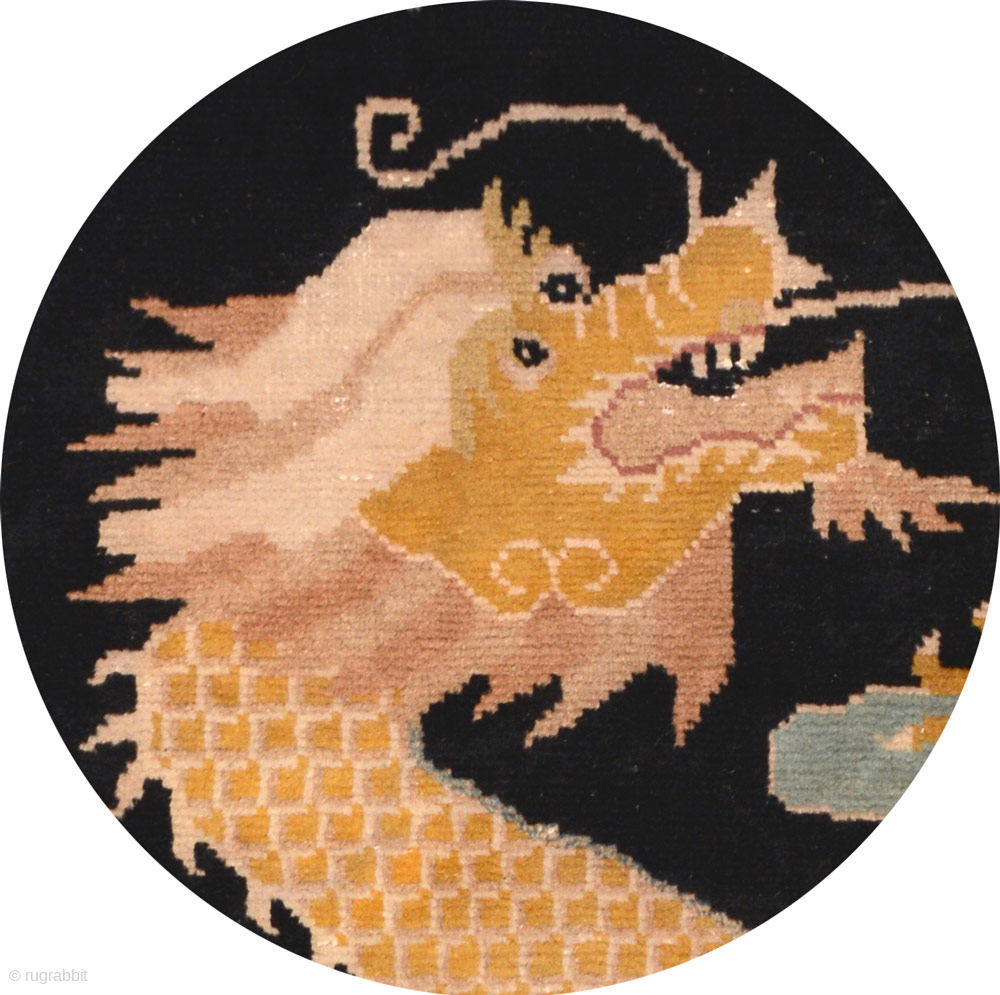 Chinese ‘pillar’ carpet made specifically to go around columns or ‘pillars’ in a Buddhist monastery. Here the golden scaled dragon is depicted chasing the Precious Jewel, with the dragons head and flowing lion-like mane and long whiskers well drawn. Made sometime circa the 1940’s / 1950, the warp and weft are cotton, the colours are quite pleasing, and the size is 220cm x 98cm (approximately 87in x 39in). Of a good manageable size, that is not too long, it would suit either wall or floor display and is in excellent condition with full pile and no repairs or reweaves. For more information and photos please see https://warpandweft.club/portfolio-item/ningxia-item-9/