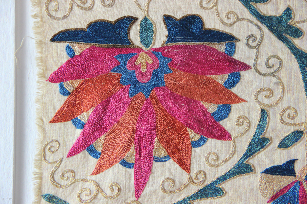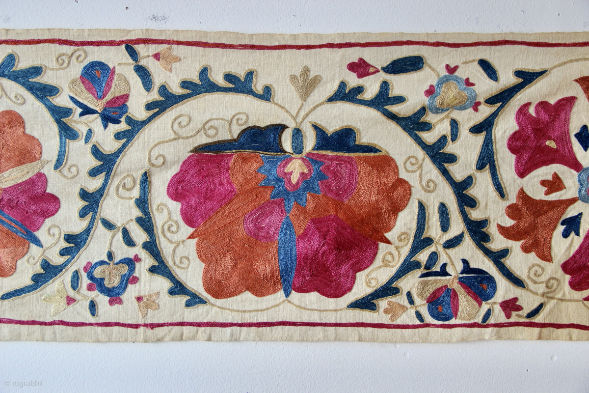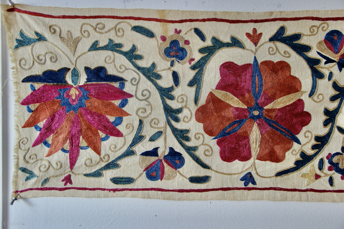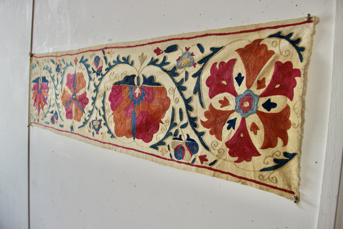 Cheerful piece of 19th Suzani border, ready for mounting and available as is.
