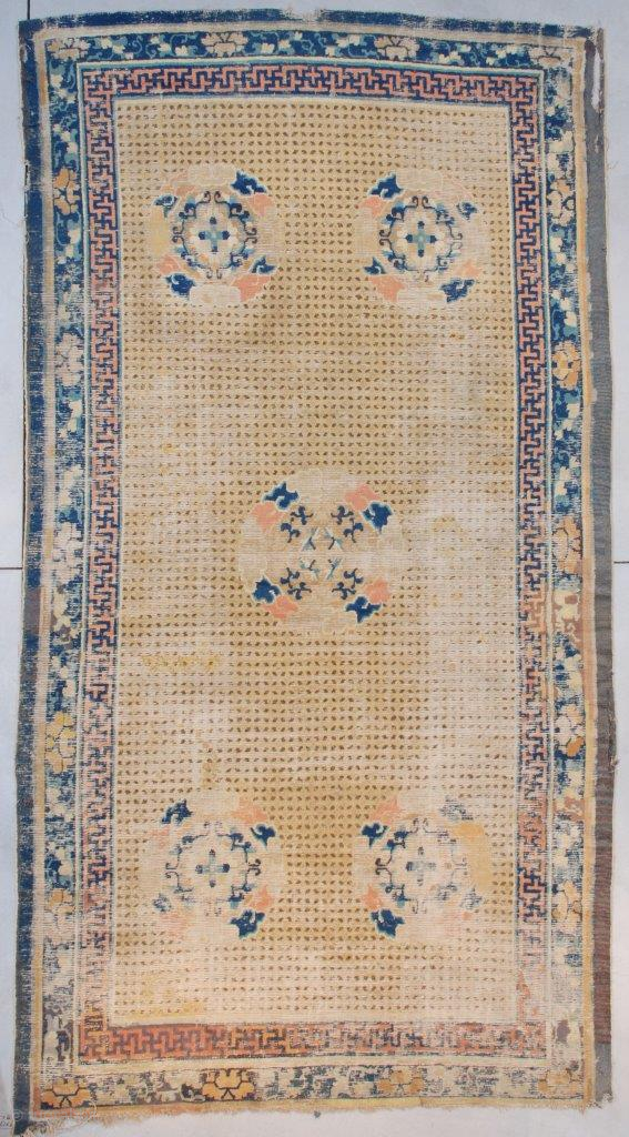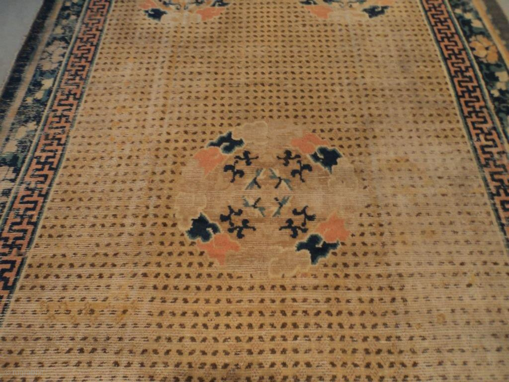 This Very Antique Ningxia Chinese Rug circa 1650 #7588 measures 6’5” x 12’5” (195 x 378 cm). It is the so called ‘Rice’ design motif on a yellow to wheat colored ground. There are five medallions with one in the center and one in each corner. The ones in each corner are different than the one in the center. All five contain variations on a cloud design in two shades of blue and peach. a floral wreath containing a cross is in each corner. The minor border is a blue running Greek key design on a peach ground. The major border is one not often seen in Chinese rugs. It is a modified meandering vine and flowers in several shades of blue and peach. The rug shows wear consistent with its age. The ends and sides are complete. It is clean and ready to go on anyone’s wall.