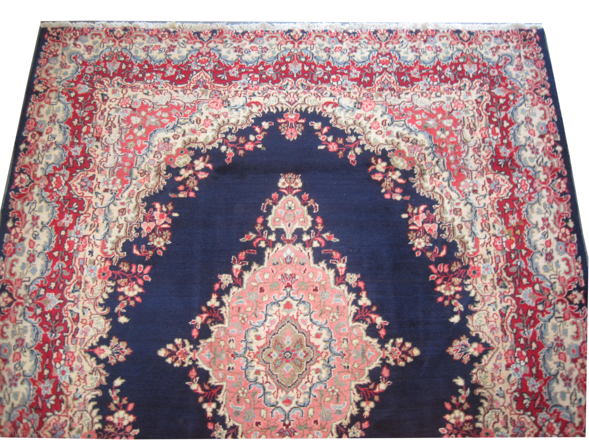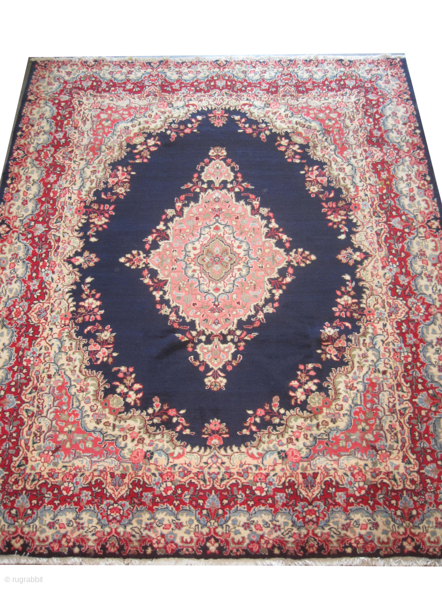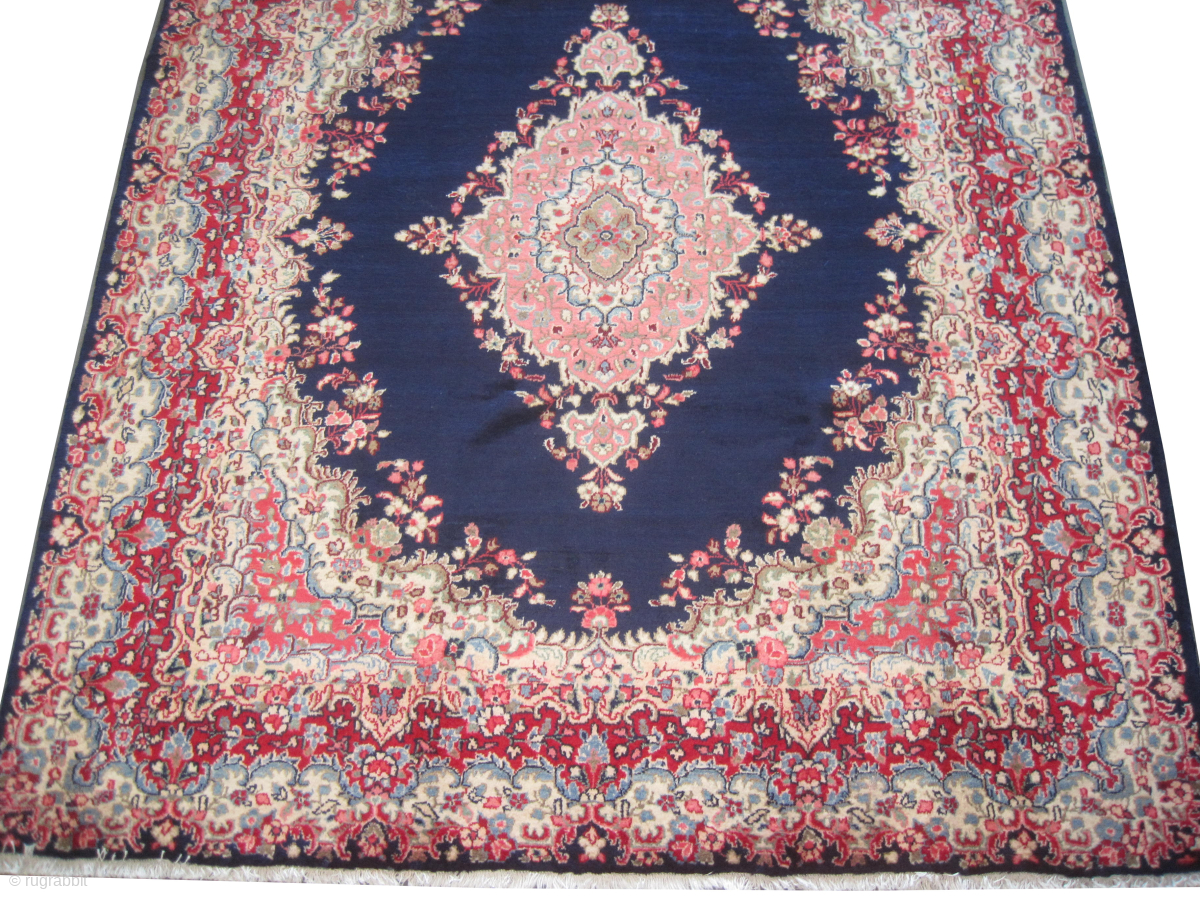 The knots are hand spun wool, indigo background, the center medallion and the surrounding border with floral design, thick pile, in perfect condition.