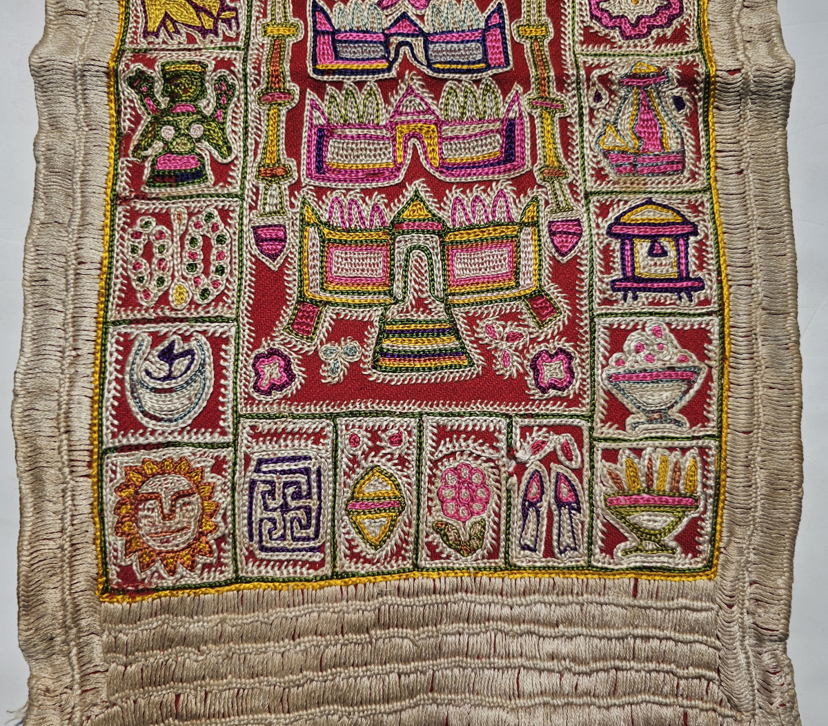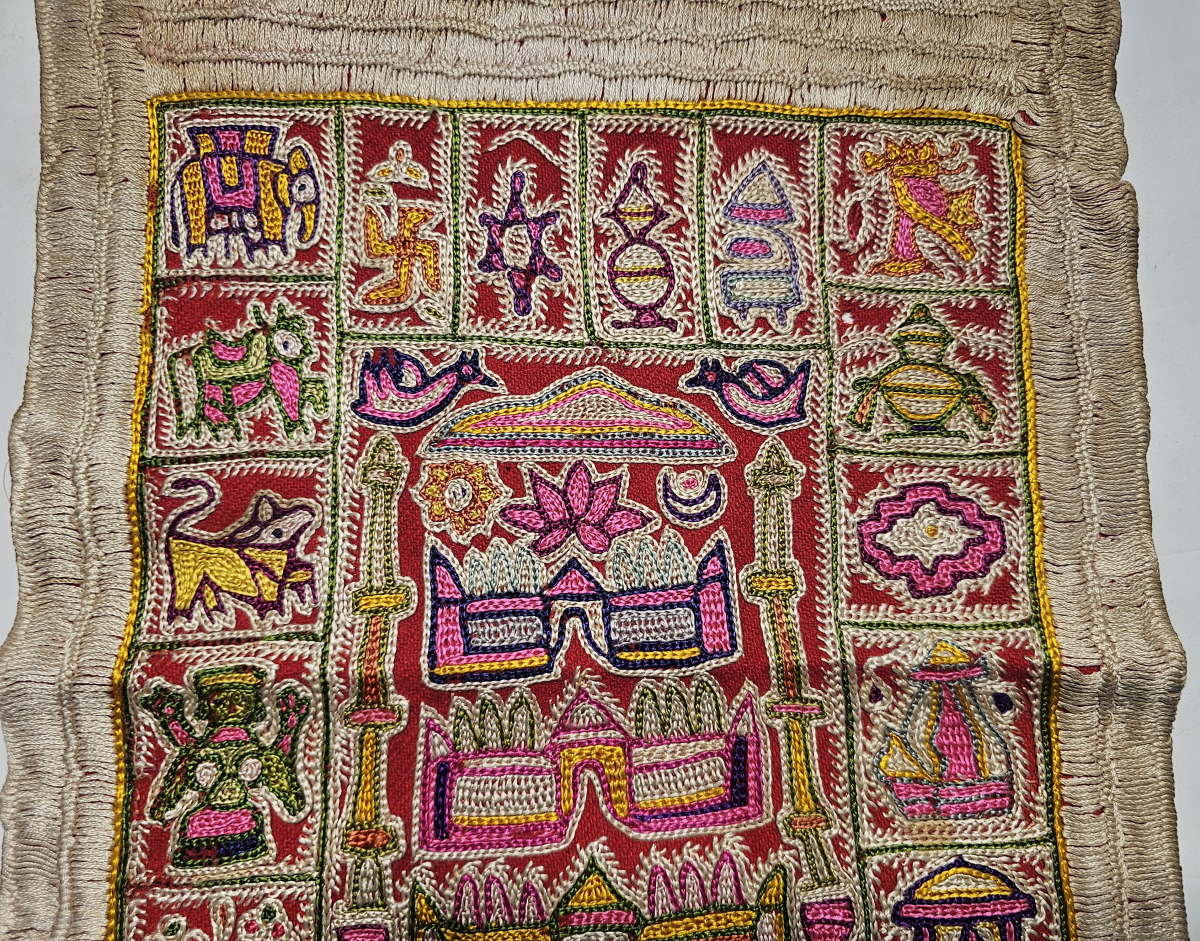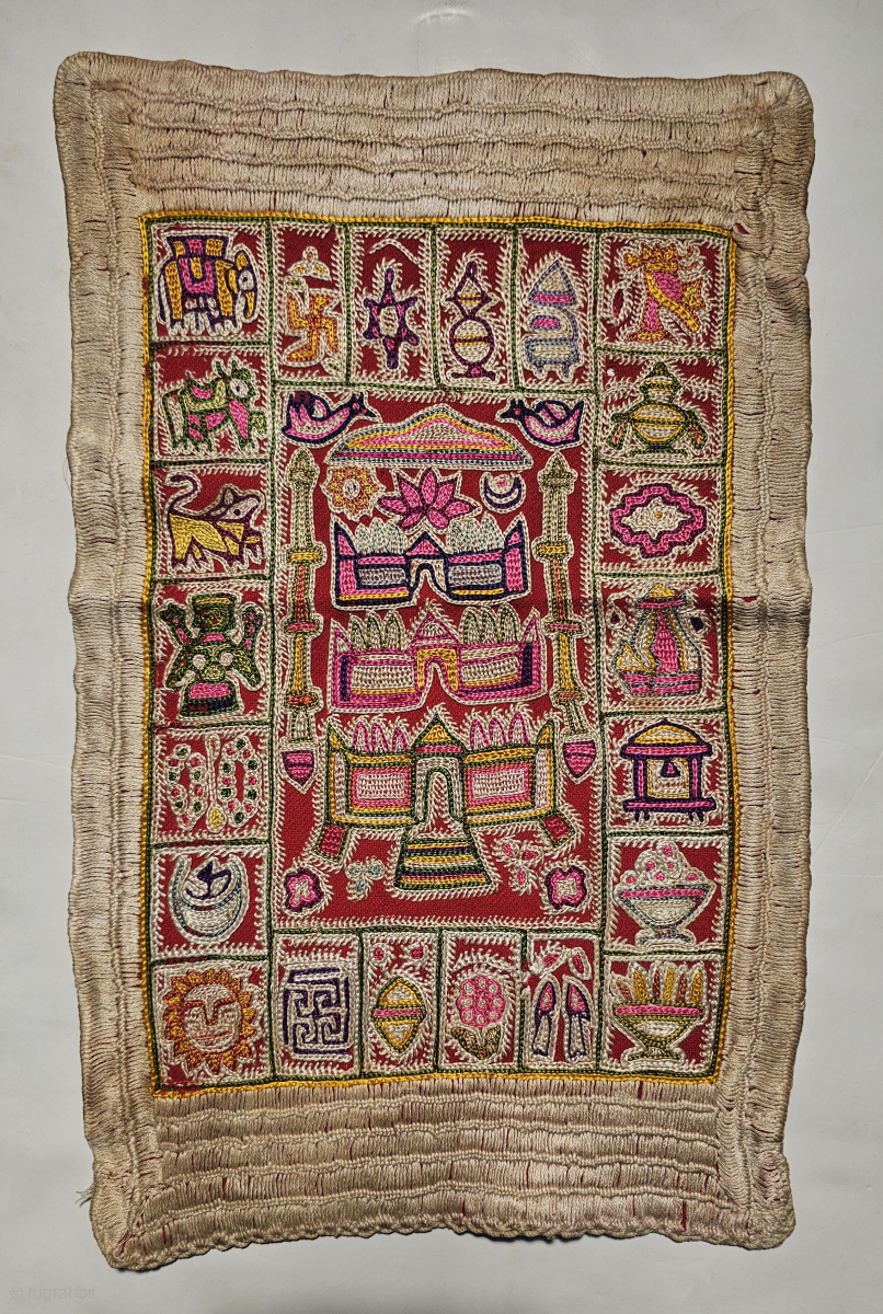 An Rare Jain Shrine cloth Ashtamangal, Mochi Bharat Chain Stitch embroidered.