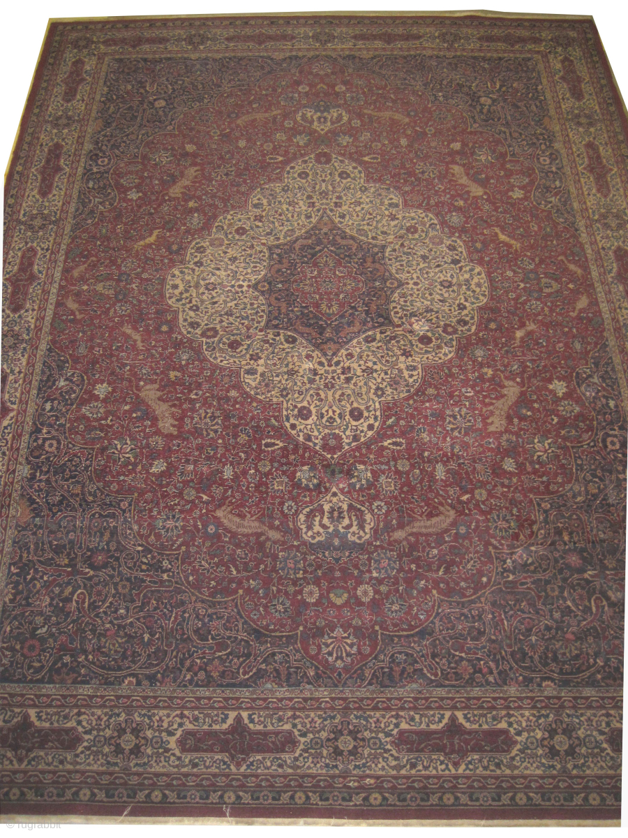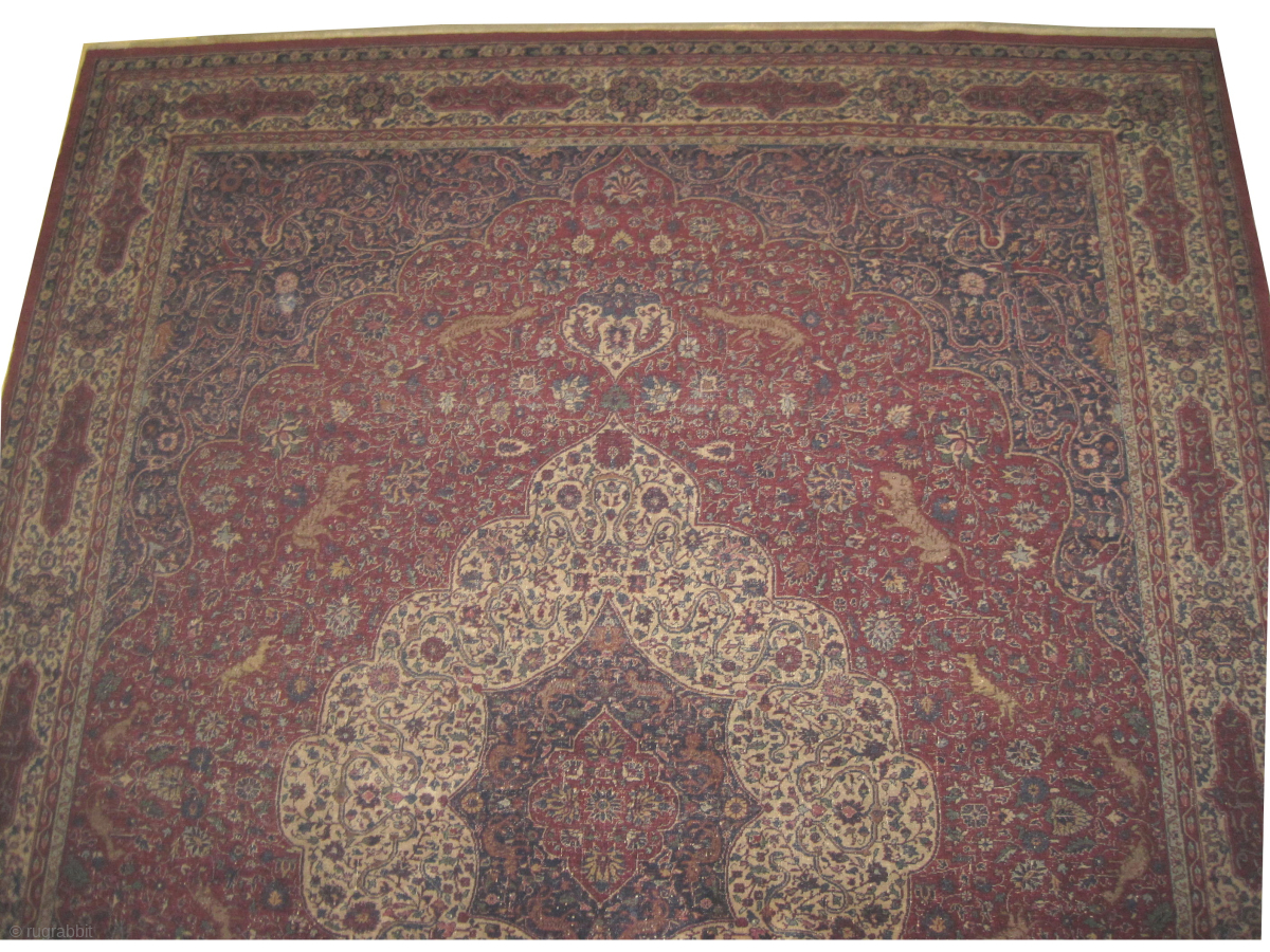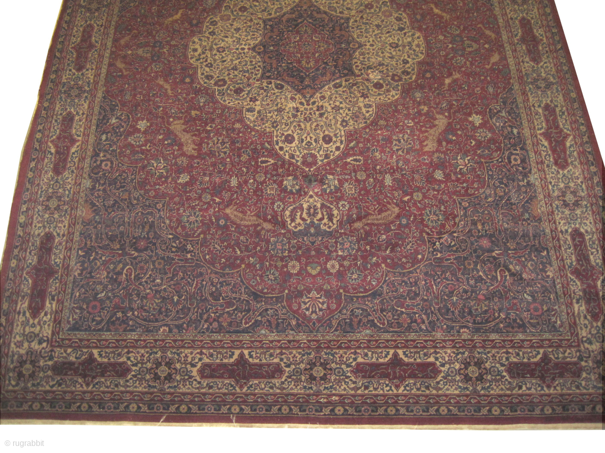 Very finely knotted, the background is dark burgundy, floral design with animals, the four corners are indigo, the selvages are woven on two lines with wool, the center medallion and the surrounded large border are ivory, the background pile is uniformly used, in its original shape.