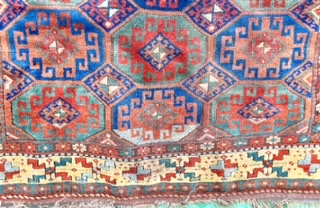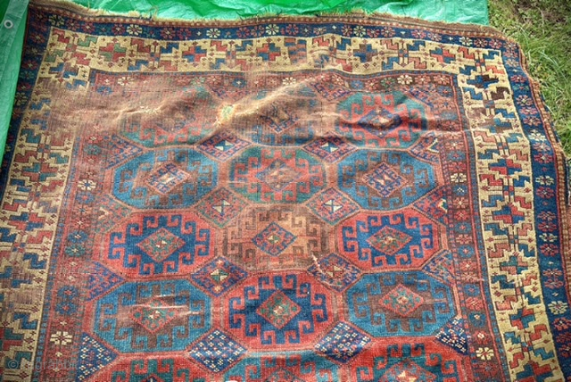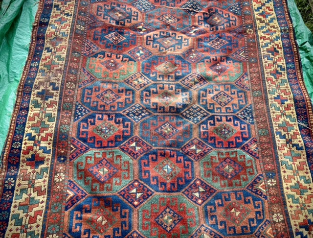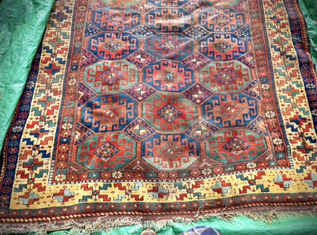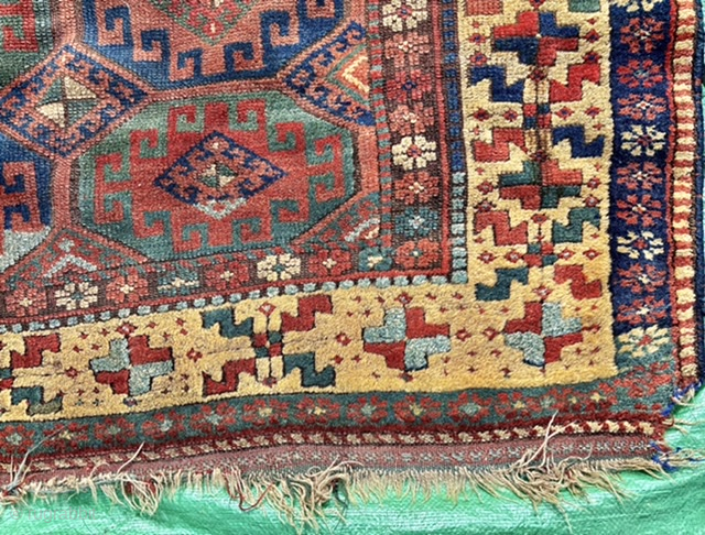 Large 19th century Caucasian carpet with Memling Gul design and great yellow border. Heavy wear one end of main field. Pure wool. Shahsavan ? Size: 365 x 183 cm