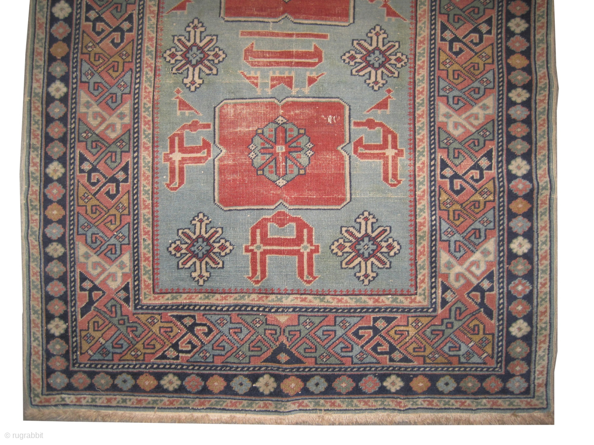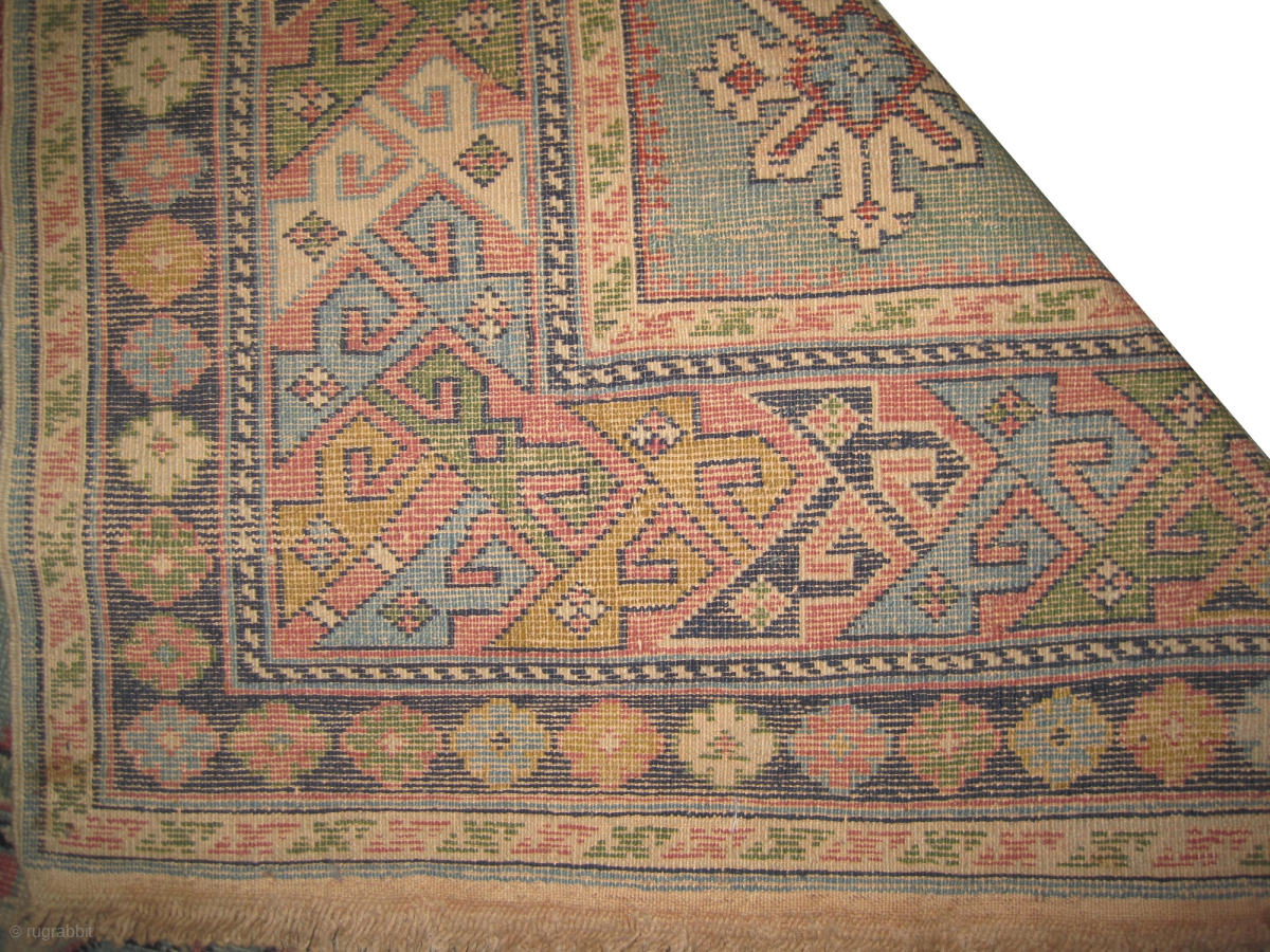 At the center certain places the pile is slightly used, the background color is sky blue with traditional Karakashli design, the surrounded large border is rust with hook design, the selvages are woven on two lines, very finely knotted, thin and elegant.