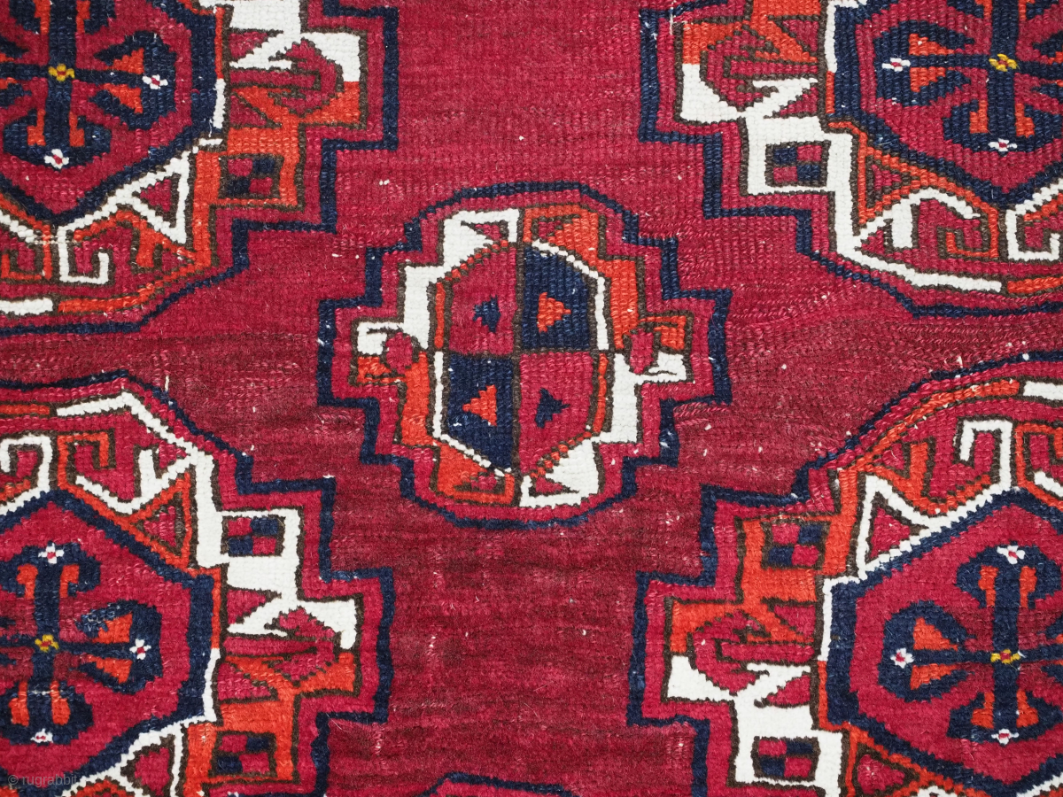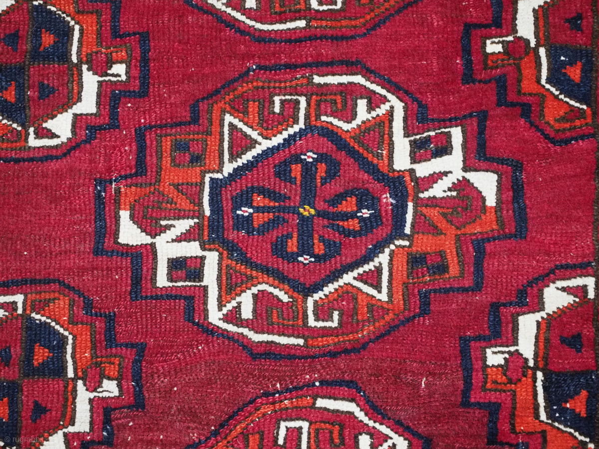 An interesting chuval face with three rows of four chuval guls on a clear red ground. The main border is a classic Saryk Turkmen design. The elem is of the flower or shrub design. All of the whites are in cotton, the wefts are also in fine white cotton.