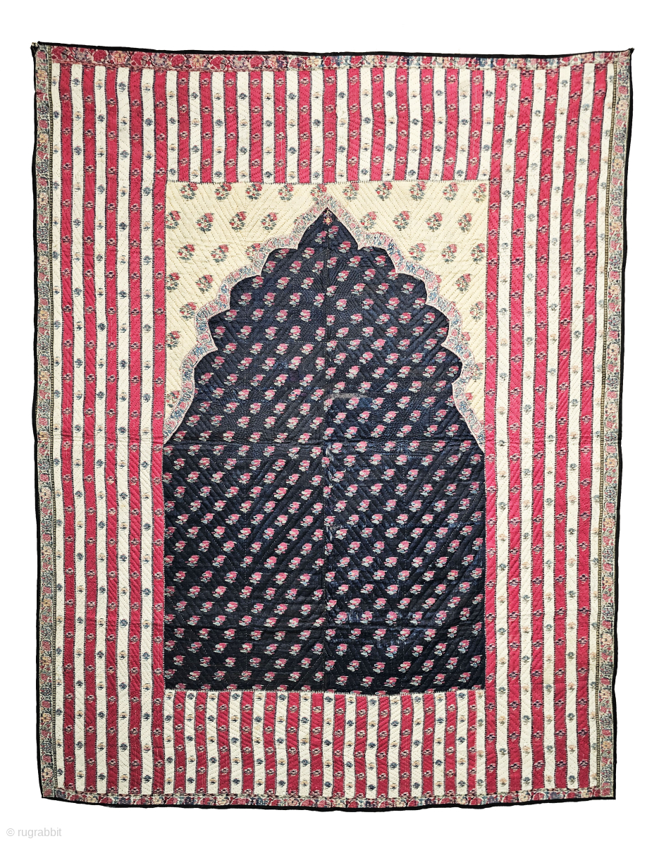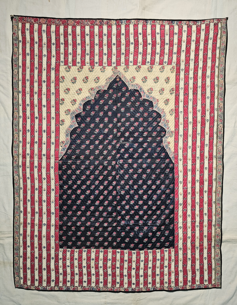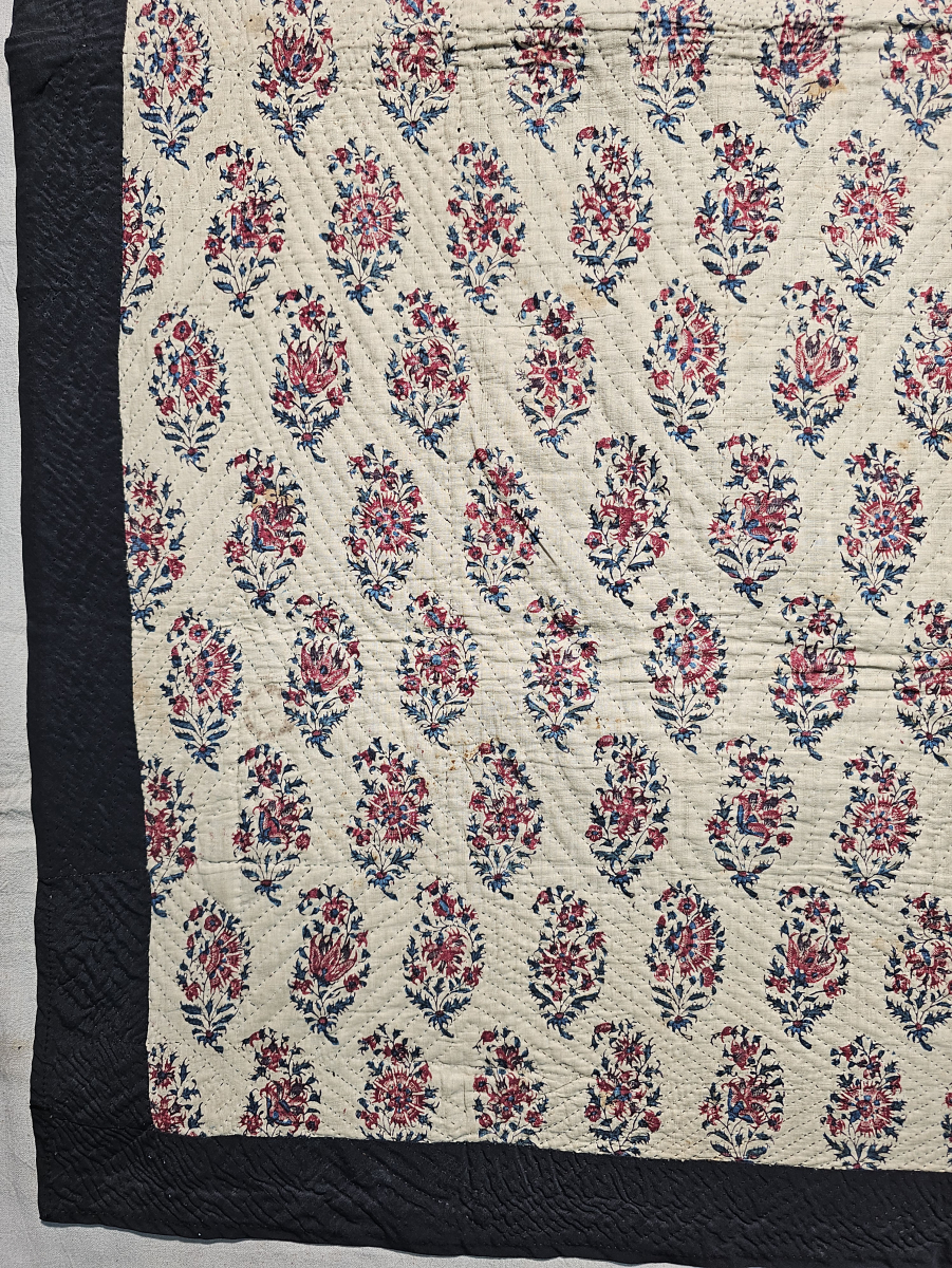 With Floral Kharash Borders in Four Side, With indigo blue Floral Jaipuri Jamawar Buties in the middle with Yellow Minaras of Jaipuri Buties Backing with Masulipatnam Kalamkari.