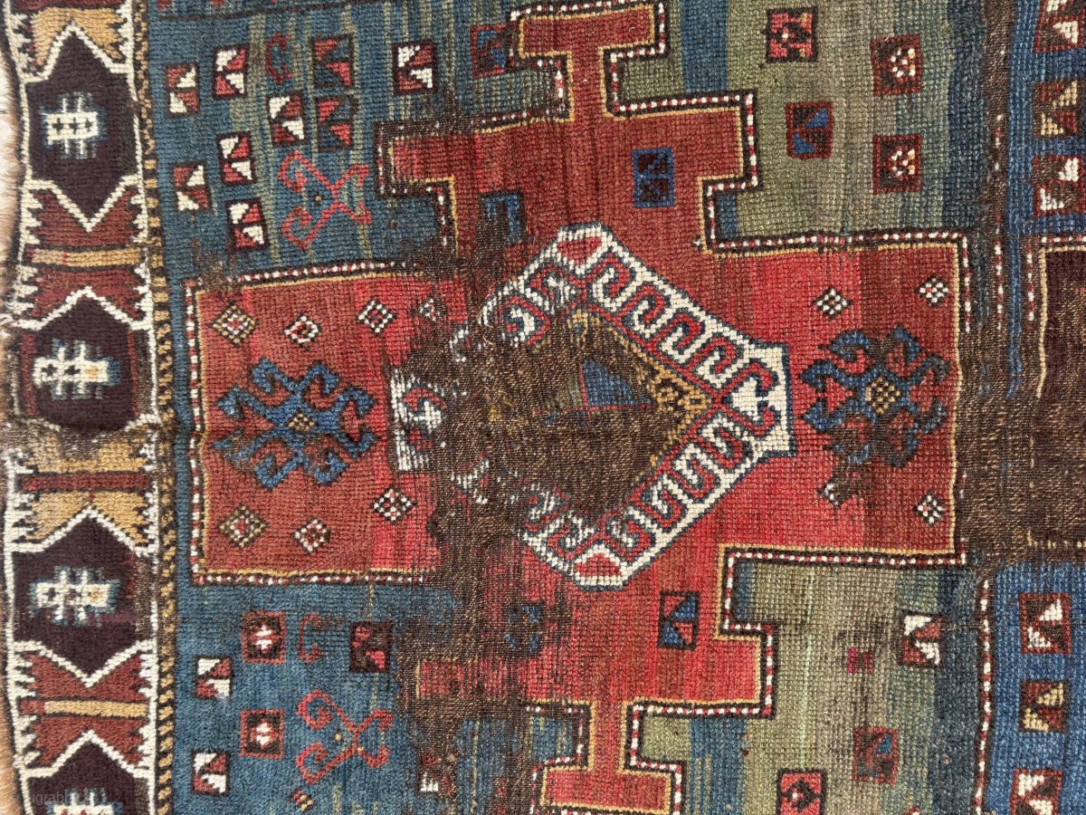 Condition: poor, unrestored. Heavy wear and oxidation, areas of pile loss, one outer border missing, the others largely intact. Despite this, the rug retains its complete design vocabulary and strong, archaic presence.