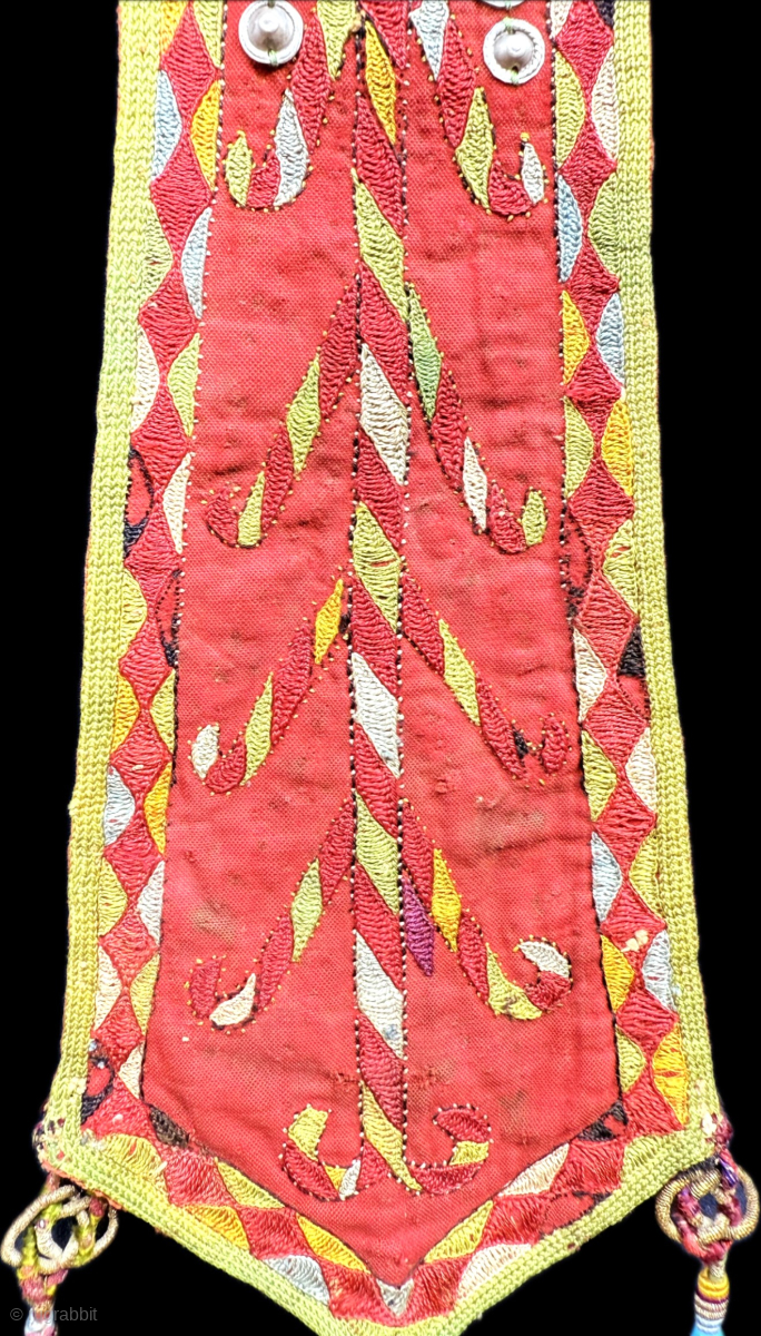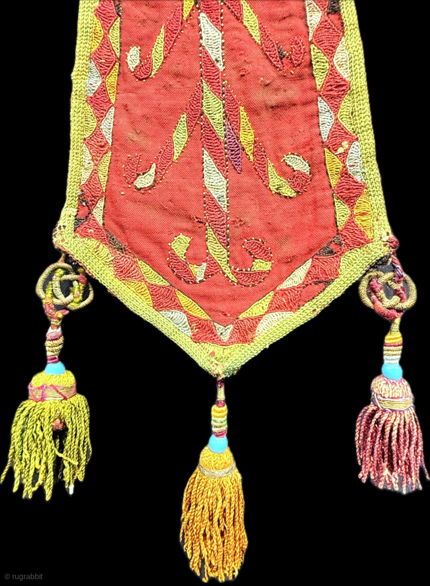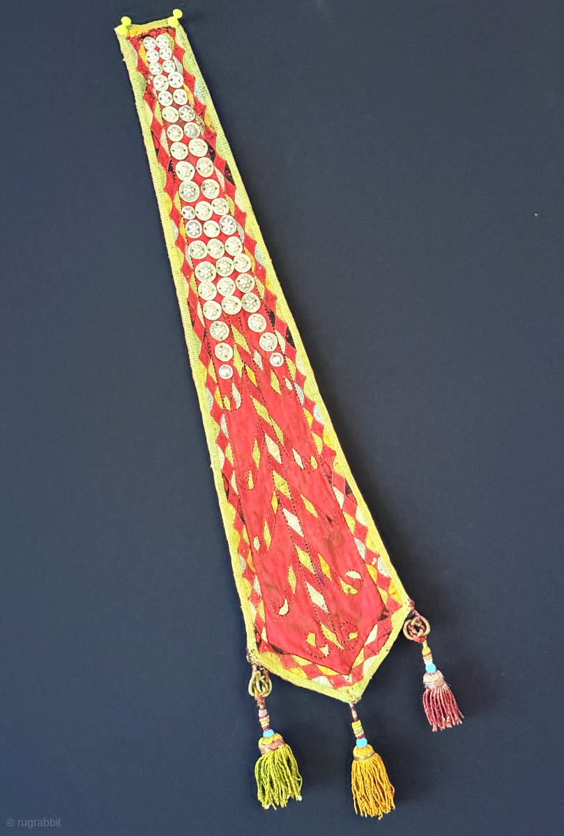 Antique Turkmenistan - Yomud tribal wedding hair band. Silk embroidery and silver plaques, silver tassel with glass beads. Size : 21'' x 5.5'' x 4'' - Lenght without tassels : 54 cm x Wide : 14 cm x Tassels : 10 cm'' turkmansilver@gmail.com.