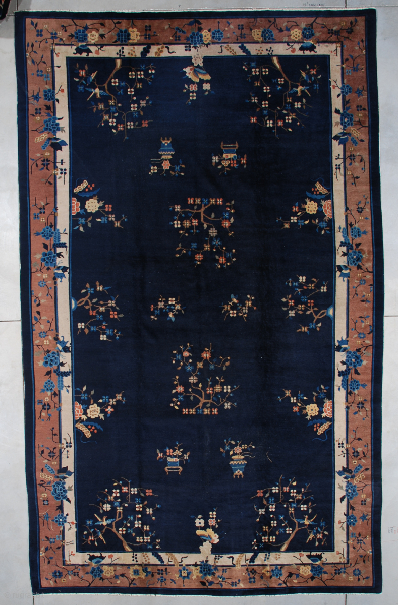 This circa 1900 Peking Chinese Oriental rug measures 8’10” x 14’6” (273 x 444cm). It has a navy blue field with flower sprays in brown, rust, ivory and light blue spread through the field. It has a double medallion of flowering trees. The corners are worked in a motif of tree branches with flowers and bricks. All is encompassed with a minor border in ivory and a major border of rusty brown. The field shows areas of low pile but the rug is at least 95% full. The ends and sides are complete. This rug is clean and ready to go.