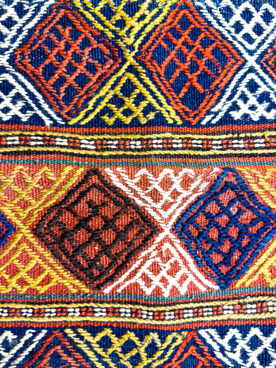 Colors: a rich and vibrant palette is used, lending energy to the weaving. Bright yellow, white, and various shades of blue and red motifs are set against deep crimson/brick red and dark blue grounds. These colors were most likely achieved using natural (vegetable) dyes.