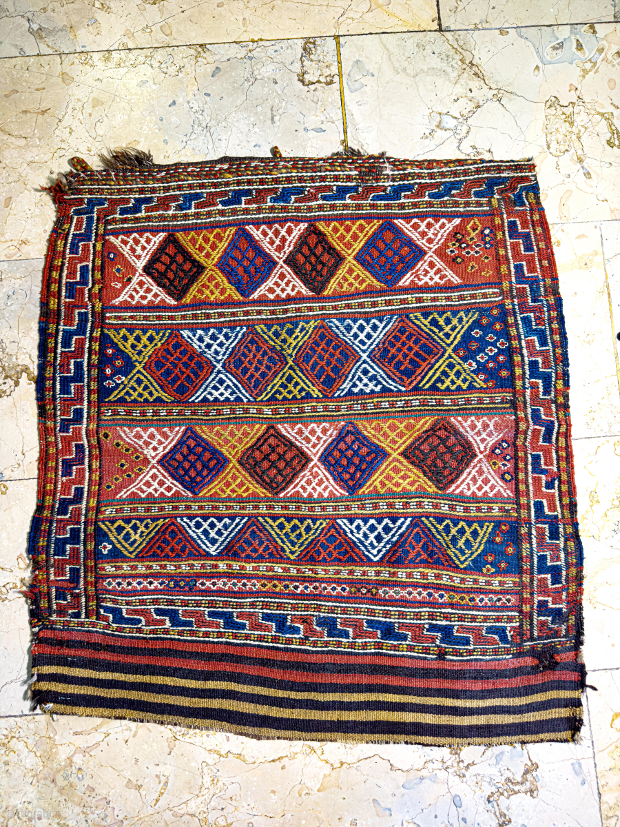 This eye-catching, nearly square handwoven textile piece is an authentic Large Bag Face (Torba) or Pillow Face that reflects the rich colors and pattern diversity of nomadic weaving art. Distinguished by its intense geometric motifs and vivid color usage, this item will instantly add an ethnic depth to any collection or decor.