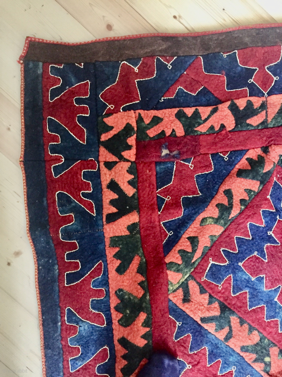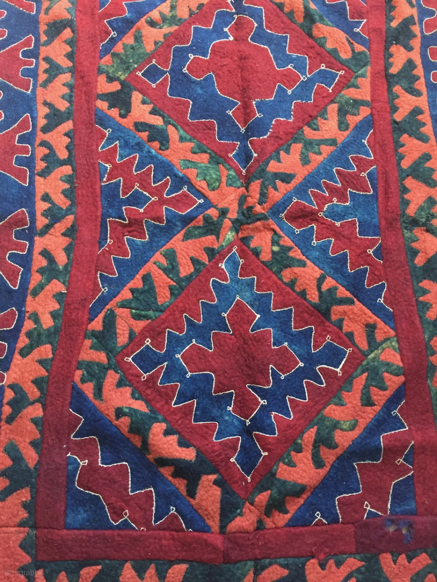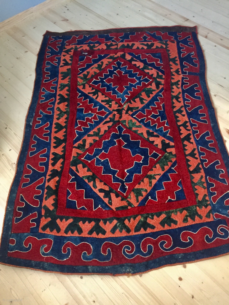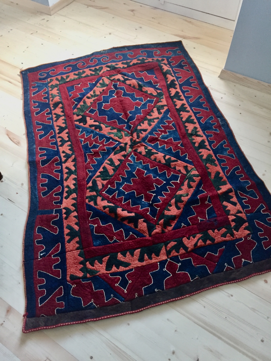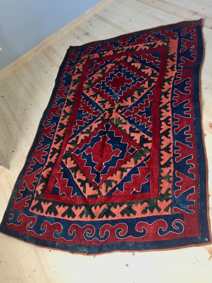 Shyrdak, Ouzbek felt, early 20th c., Northern Afghanistan, probably Lakay as a similar example is shown with lakay tribes in wonderful book of french ethnologue Bernard Dupaigne "Asie Nomade", p.54. It was intended to be hanged as en ensi, with a separate brown part at the upper part. contact: thierrygirard@protonmail.ch