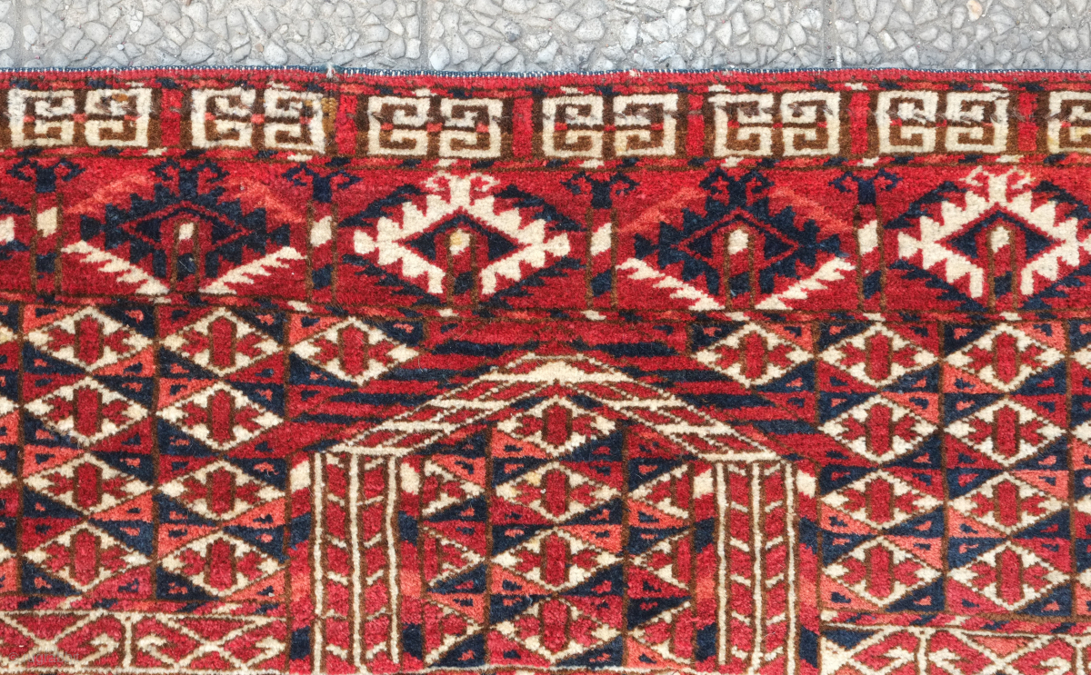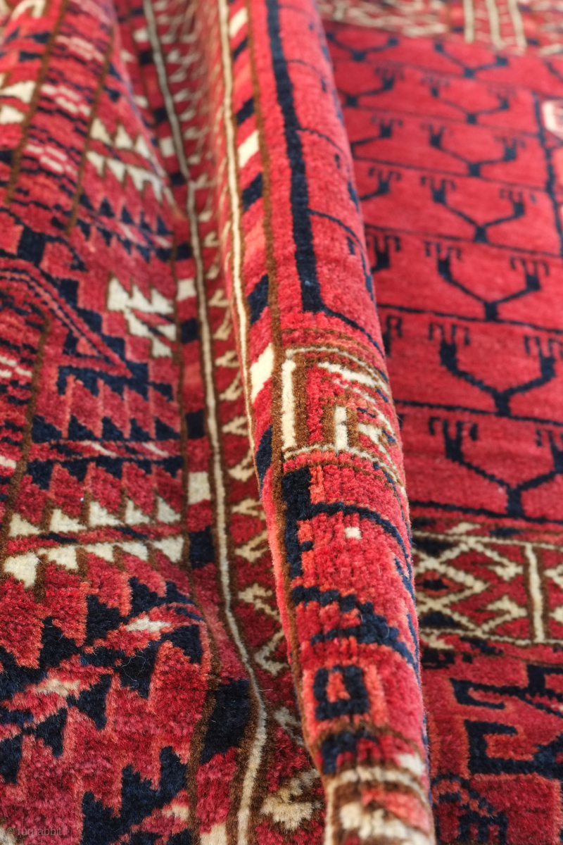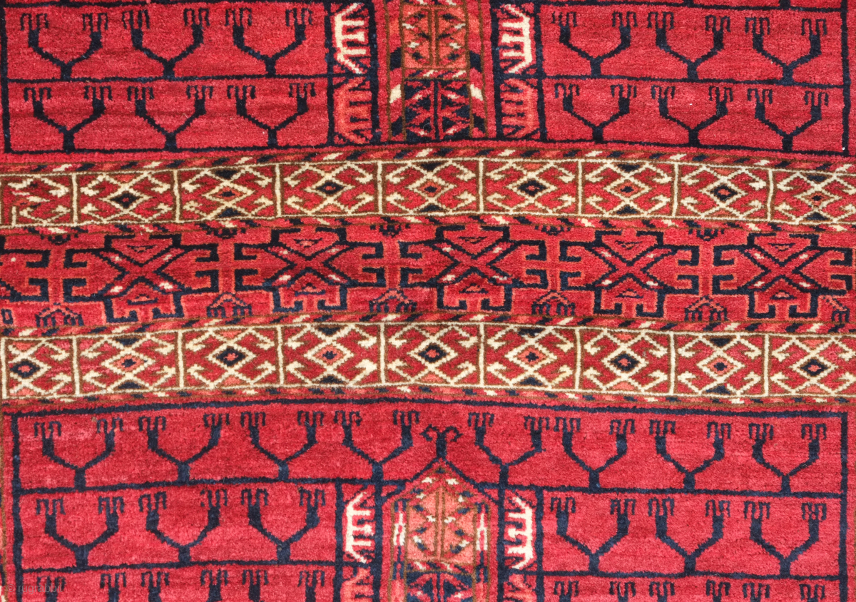 Tekke Engsi, 19th century. Deep, rich red ground topped with a mihrab. Soft, full pile. Slight wear shown in last image (pile is full but there is some loosening in the weave). 134 x 164 cm. Contact danauger@tribalgardenrugs.com