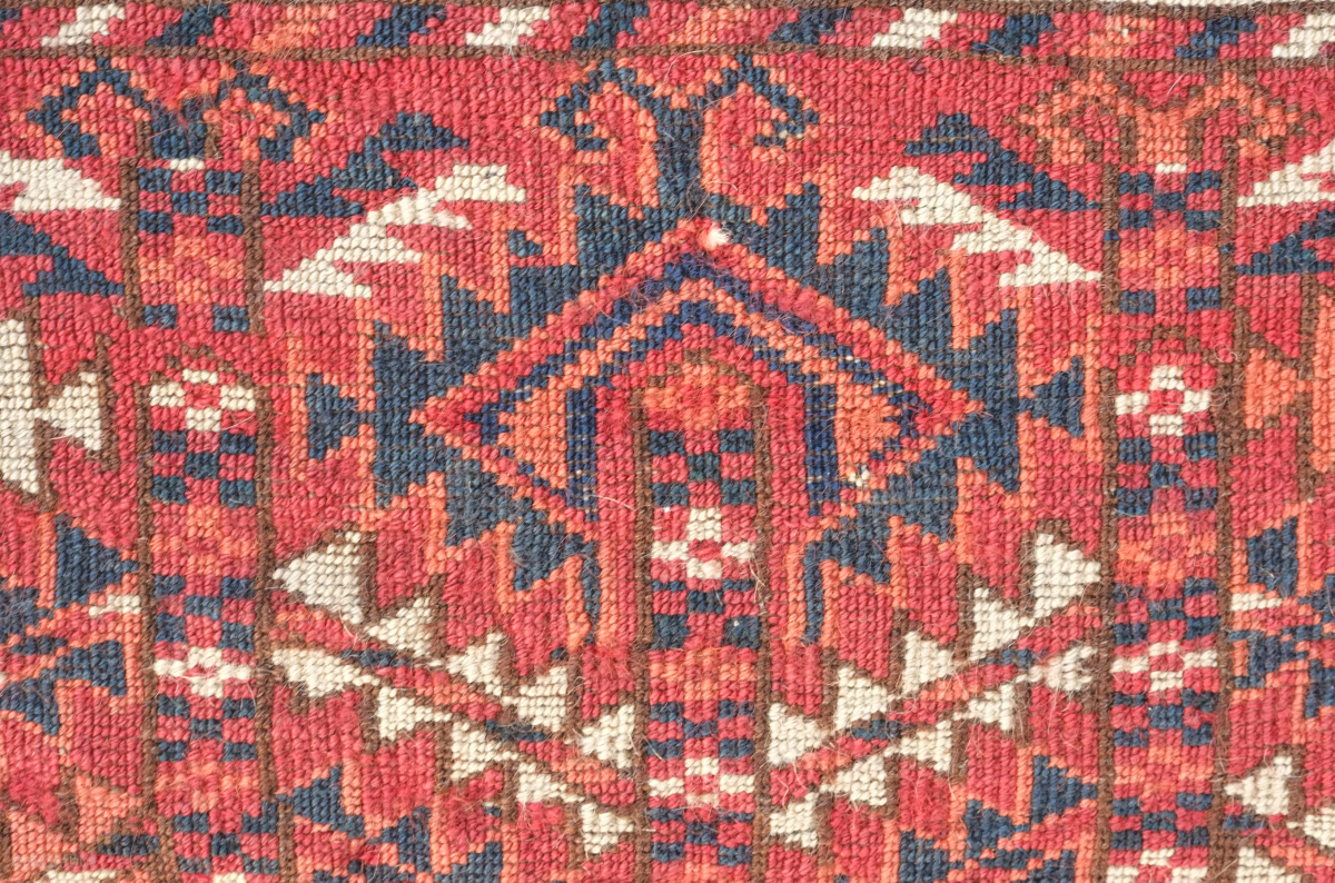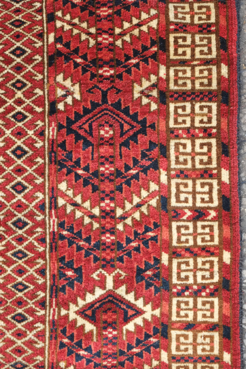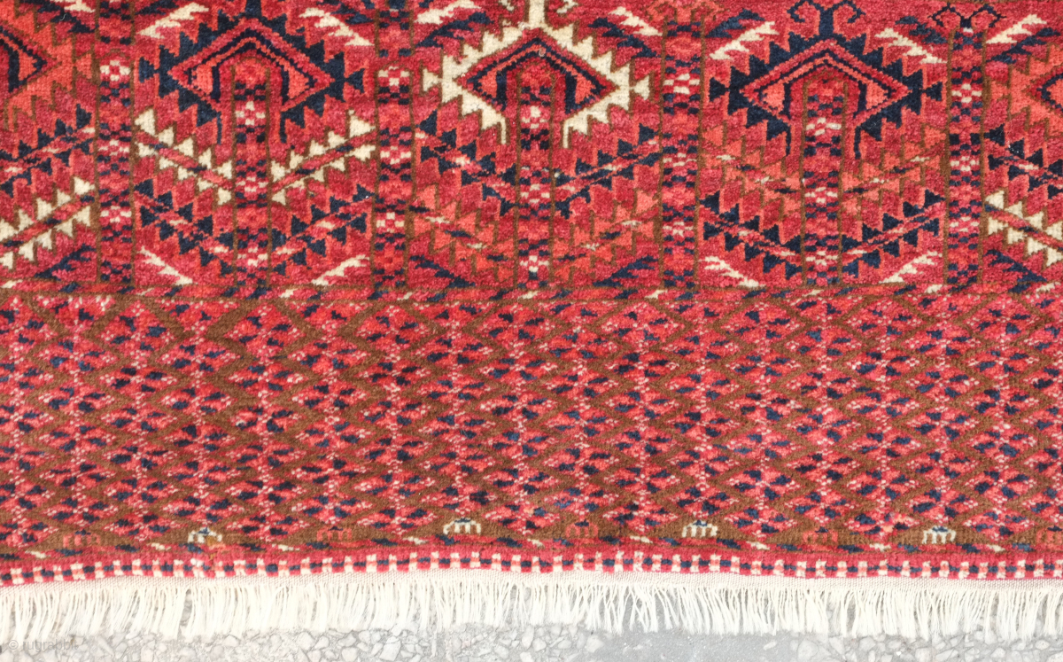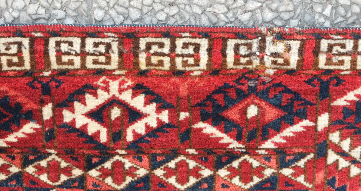 Tekke Engsi, 19th century. Deep, rich red ground topped with a mihrab. Soft, full pile. Slight wear shown in last image (pile is full but there is some loosening in the weave). 134 x 164 cm. Contact danauger@tribalgardenrugs.com