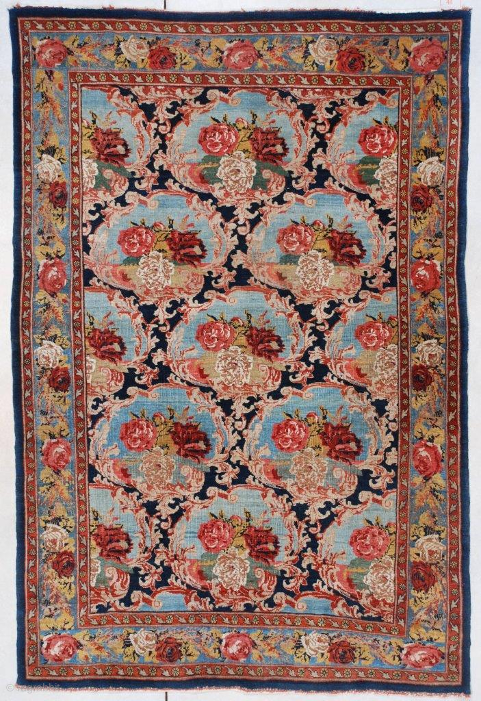 This circa 1910 antique Bidjar Oriental Rug #7472 measures 4’4” x 6’6”. This is a very lovely French design antique Bidjar. The roses, which are typical in this type of Bidjar, are contained in very pale sky blue wreaths throughout the field of the rug. The roses are done in dark red, dusty rose and white. They are exceedingly well drawn. One wants to reach down and pick one bringing it up to the nose and taking a sniff! The rug is encompassed with a major border of the same roses on a slightly darker blue ground. The rug is in near perfect condition. The ends and sides are complete. It is clean and ready to go.