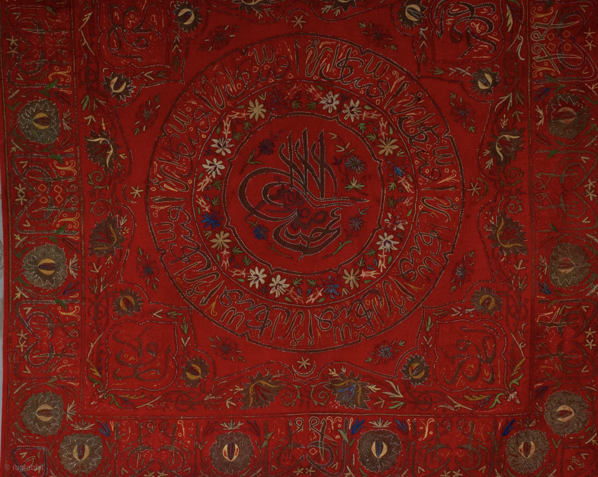 Large Square textile with silk and gold thread embroidery , pseudo Kufic and central Sultan's Tugrah probably used as a turban cover Kavuk Ortuso&n late 19th c Measures : 46" x 46"