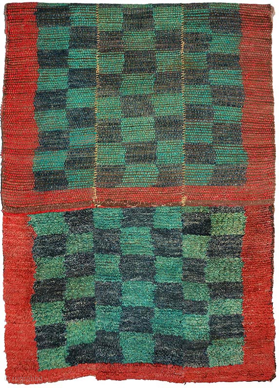 Tibetan three panelled checkered tsuktruk, abrashed throughout, the checkered pile center is of alternating blue-green and dark blue 'squares' which are surrounded by a red pile border that mimics the red covered felt border seen on many Tibetan rugs. The size is 157cm x 72cm (approximately 62in x 28.5in), it was made in the early 1900’s, has thick pile and the warp and weft are of hand spun wool. These minimalist but captivating weaving's are of nomadic origin and although this one could certainly use a wash, other than some wear along the selvedge's is in good condition. For more photos see here https://warpandweft.club/portfolio-item/tsuktruks-item-6/