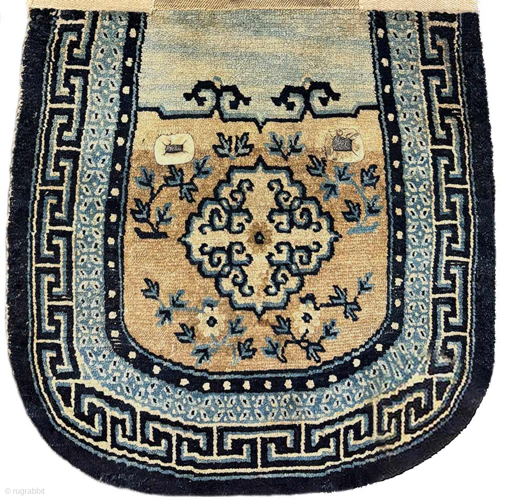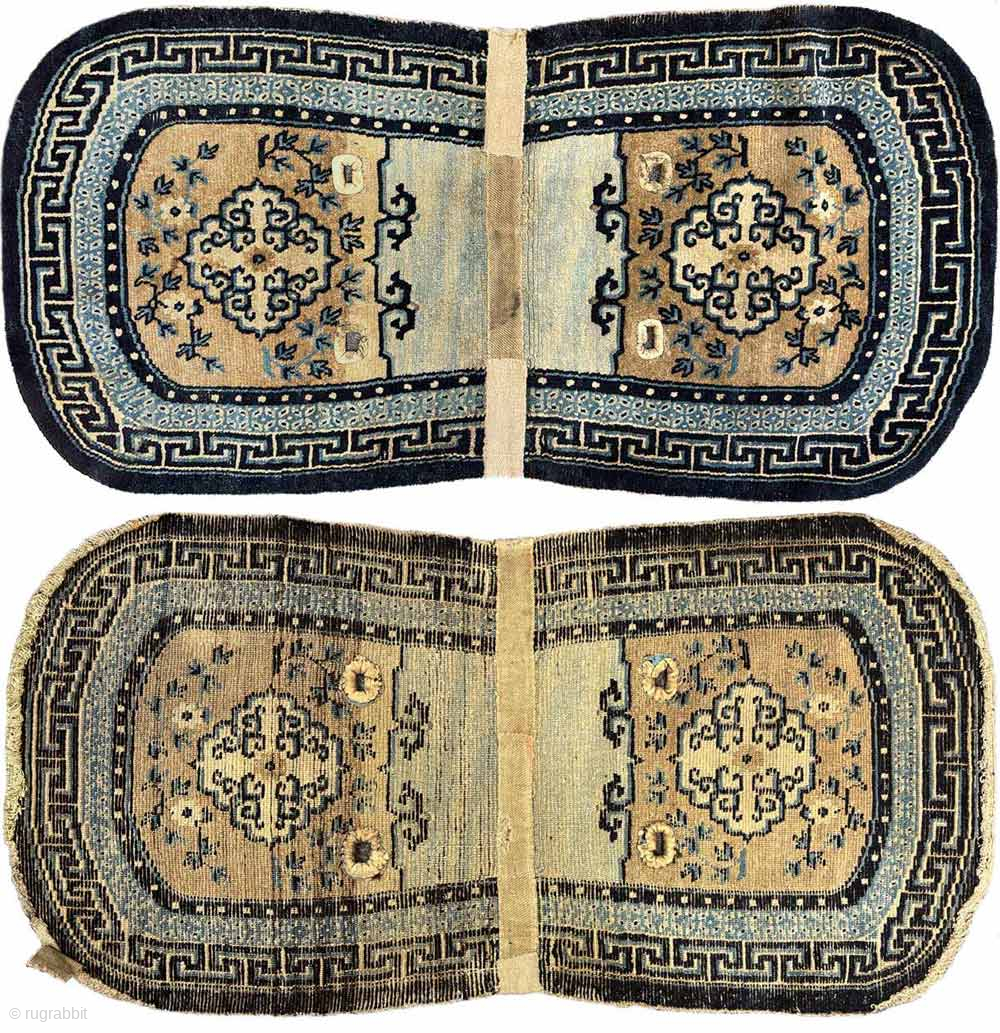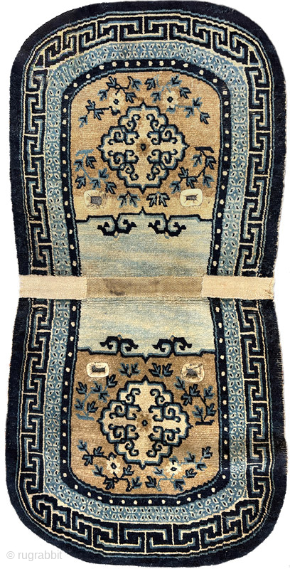Attractive oval shaped Tibetan under-saddle carpet (makden) with mandala-like medallions, surrounded by simple floral displays, a secondary border with the lovely 'rice grain' pattern and a main outer border with the 'running t' design. Made sometime in the later part of the 1800’s / 19th century, the size is 109cm x 60cm (approximately 43in x 24in), the colour palette is from natural dye and undyed wool, the warp and weft are both wool and all four of the saddle girth strap holes have been incised and bordered with leather and it has no repairs or reweaves. For more photos of this makden please see - https://warpandweft.club/portfolio-item/makden-item-33/ and a somewhat later but rectangular shaped makden of similar design and colours here https://warpandweft.club/portfolio-item/makdens-item-2/