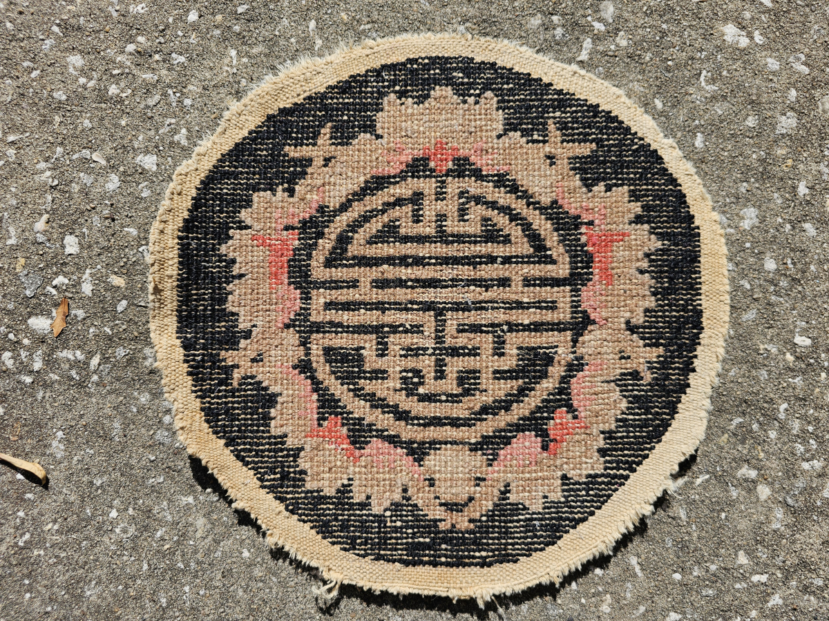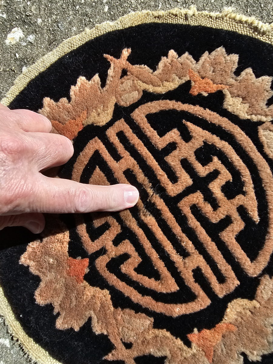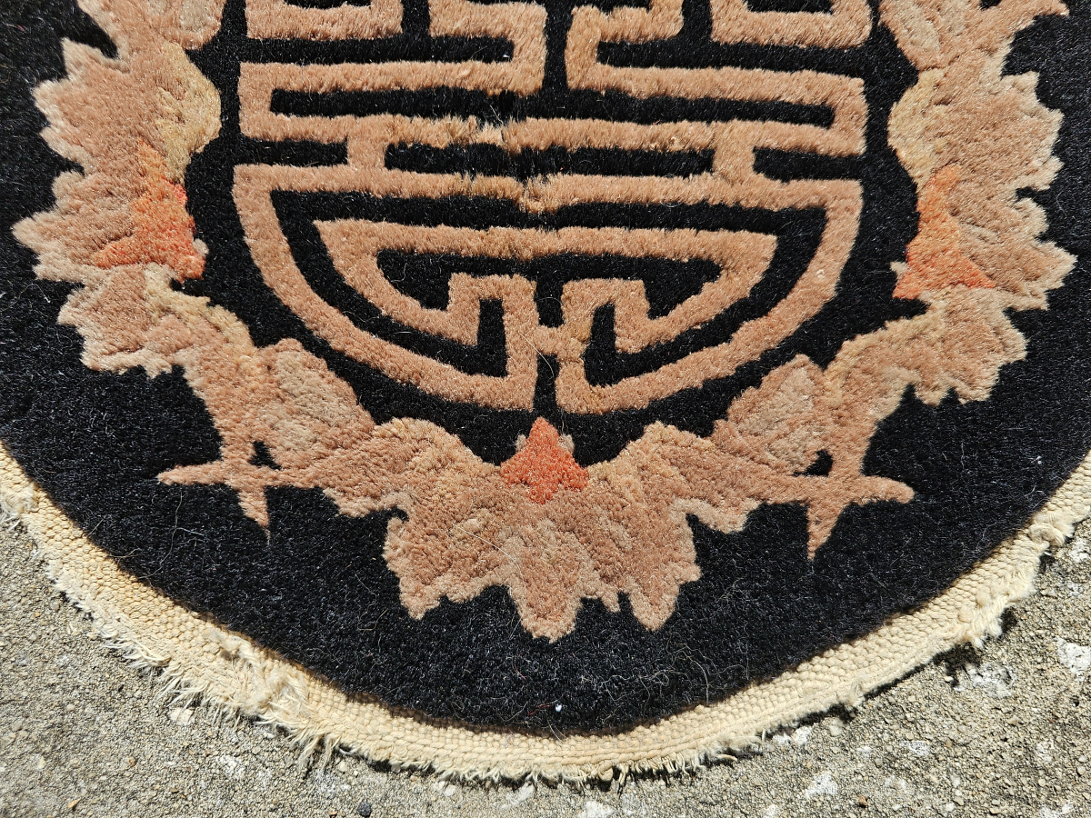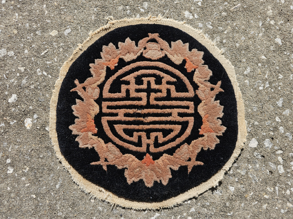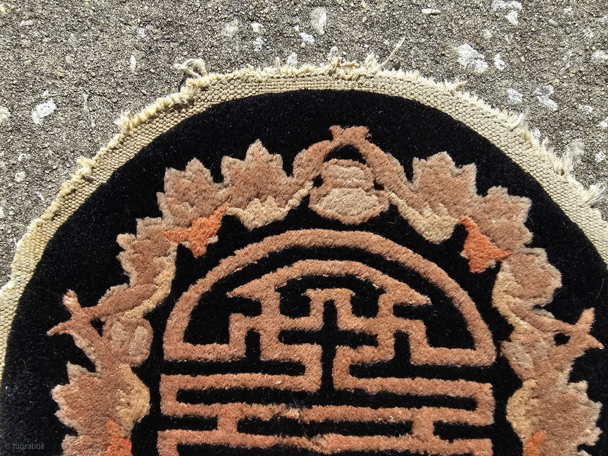 Small round Chinese rug from the Art Deco period, Fette-Lee type weave, black with Shou and bat design, the Shou symbol represents long life and monetary abundance, bats are a symble of good luck, good pile with some missing fringe, small amount of insect damage as pointed out in the photos, general good strong condition, the approximate size is 13 inches across, a great table topper, $48.00 plus shipping, contact at aarthur@cyberrug.com if i don't respond in rr, i chose the Shou symbol for the logo of my business, it has served me well since 1988