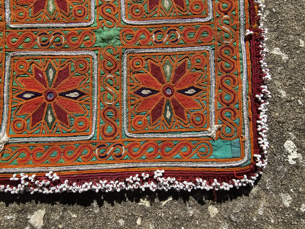 Pashtun dress panel, 20thC vintage, Afghanistan, embroidery, mirrors, and glass beads, very good condition, approximate size 9.5 x 9.5 inches, general good condition, $65.00 plus shipping, if i don't respond to your request, please email me at aarthur@cyberrug.com