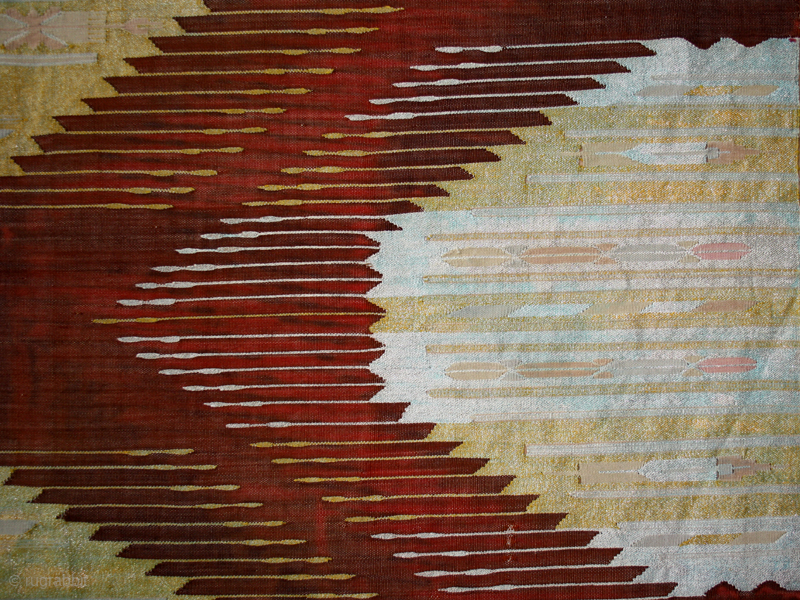 Pair of textiles cod. 0673. Silk metal threads. Aleppo – Siria. Late 19th. century. Measurement cm. 70 x 296 each ( 27.5 x 116.5 inches each). Very good condition with some missing threads.Mounted separately on black cotton. Offered separately or as a set.
