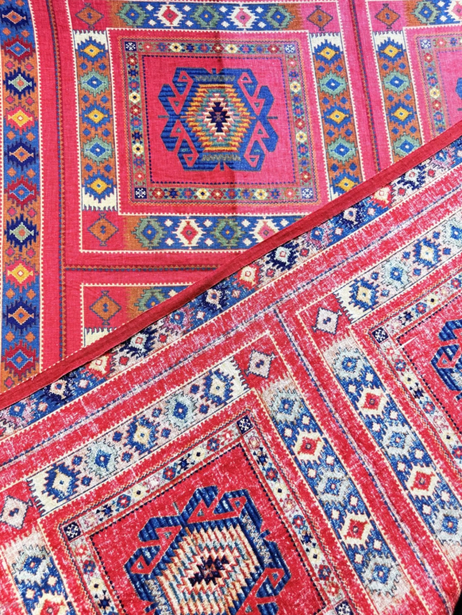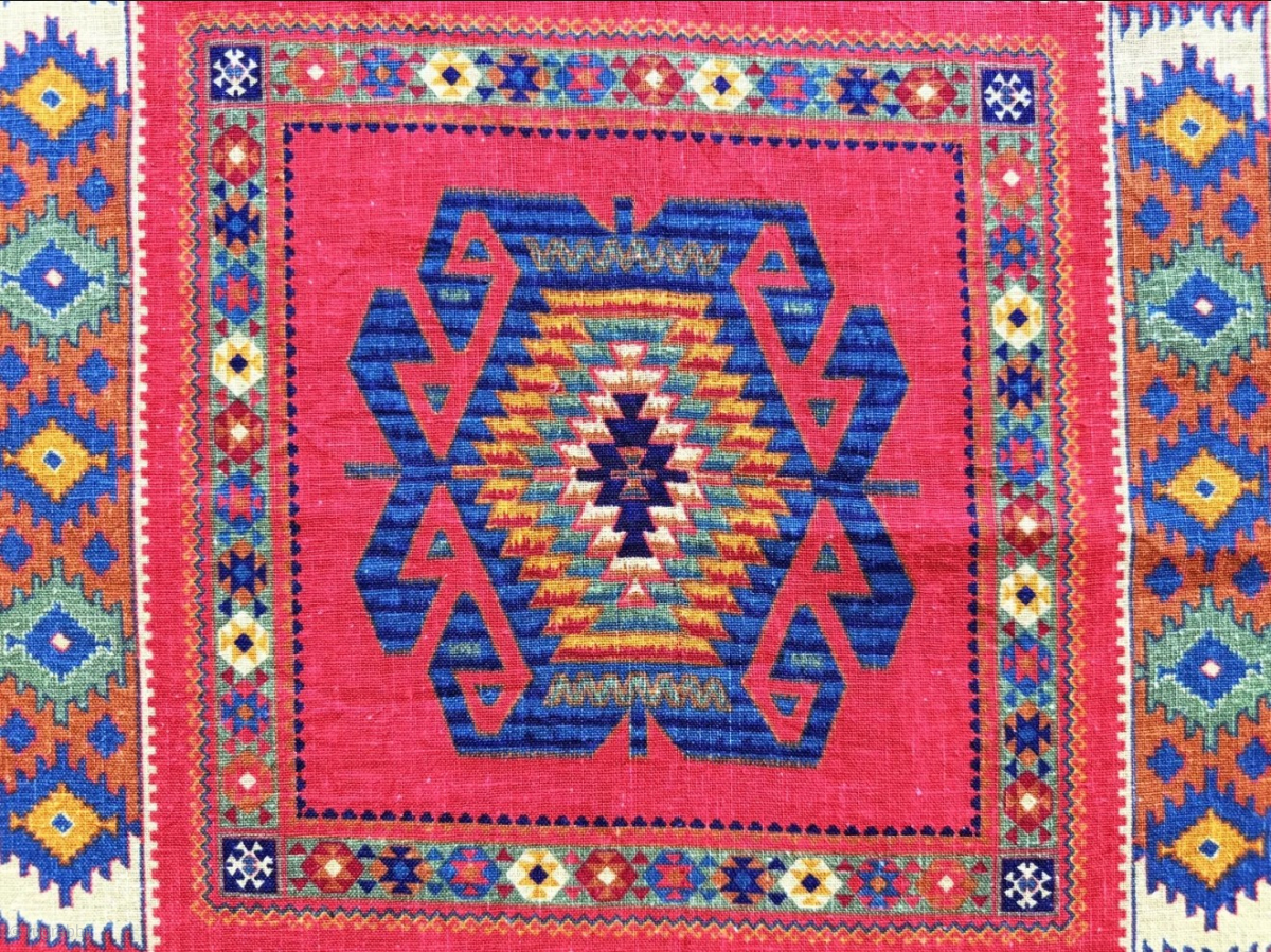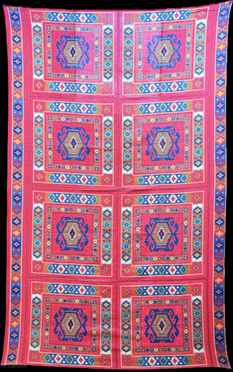 Azerbaijan block printed cotton with rug - kilim dizayn hanging. Fairly survived in great condition. All natural dyes are used in block printing. Size : (75.5'' x 33.5'') - (''192 cm x 85 cm'') turkmansilver@gmail.com.