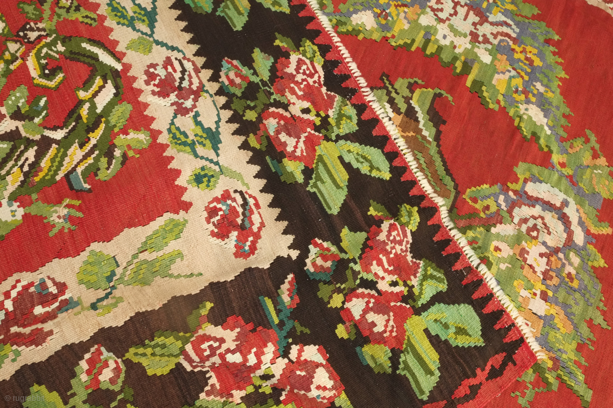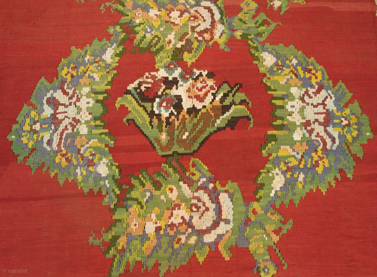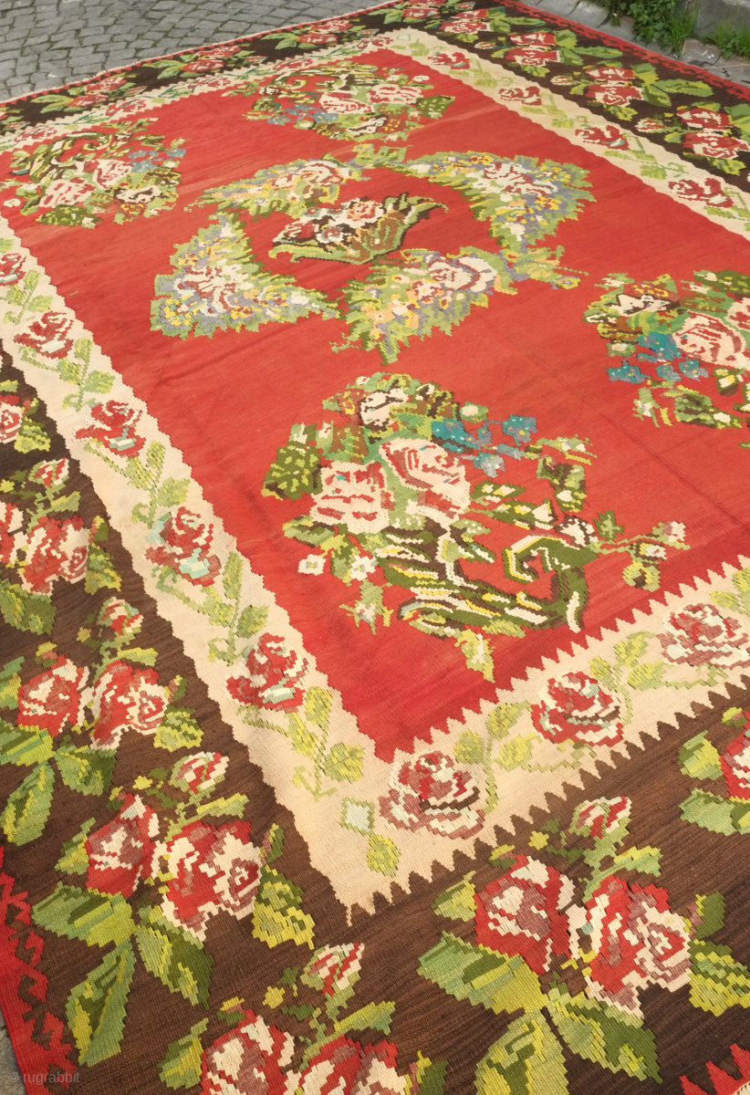 An early 20th century or late 19th century Serbian/Yugoslavian kilim in French or ferangi floral motifs. Fantastic colors and perfect condition for that living room. 300 x 400 cm. Contact danauger@tribalgardenrugs.com