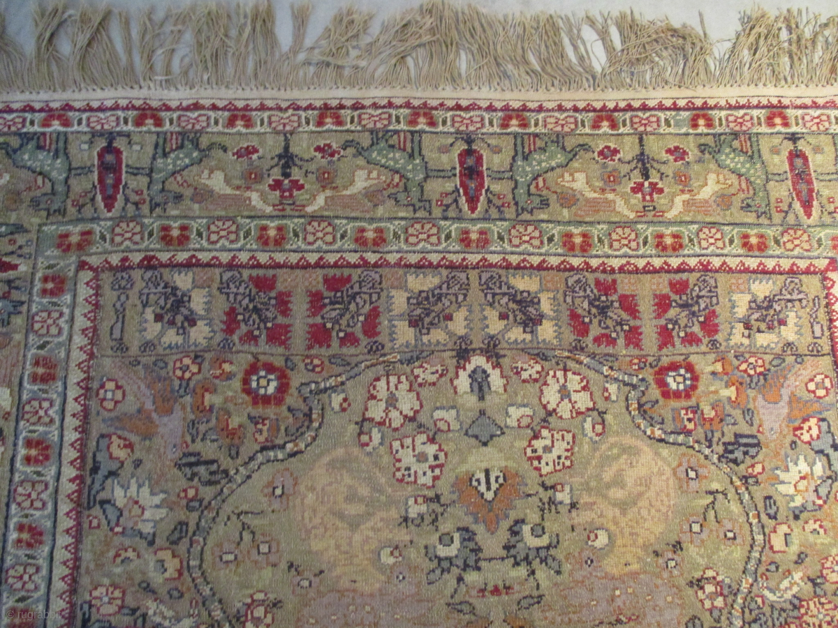 This mid 19th-century Turkish Kayseri silk and metal rug measures 4’4” x 6’10”. It has a center medallion with a double Kum Kopu prayer niche at either end completely covered in a floral design with two pair of lions done in aubergine devouring antelope in the four corners of the field. At the peak of the prayer niche at either end are two yellow cheetahs devouring some sort of animal done in aubergine. The background is the color of gold.The reciprocal borders are pretty odd. The interior border is done in metal and silk. The exterior border is done only in silk. These reciprocal borders encompass the major border composed of wild spotted dogs flanking cypress trees done in red. In between the pairs of dogs is a small tree of life motif with two archaically drawn birds above it. This rug is really quite complicated. There are rings sewn on the back of the rug for hanging and i don’t think the rug has ever been on a floor. The ends and sides are complete. The rug is clean and ready to go.