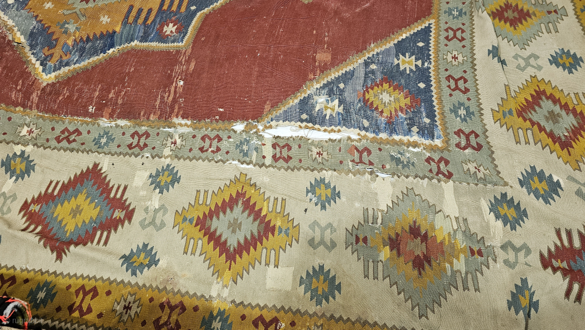 This Balkan kilim (likely a Pirot or Chiprovtsi) once graced the floors of an 1800s mansion, witnessing centuries of history. Though it shows the graceful signs of time and wear, it is now looking for a new custodian to restore its former glory.