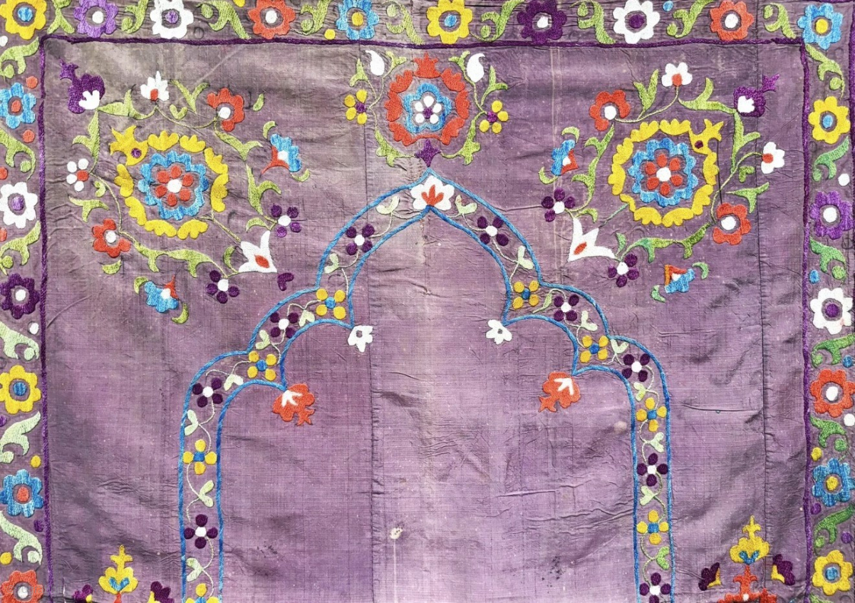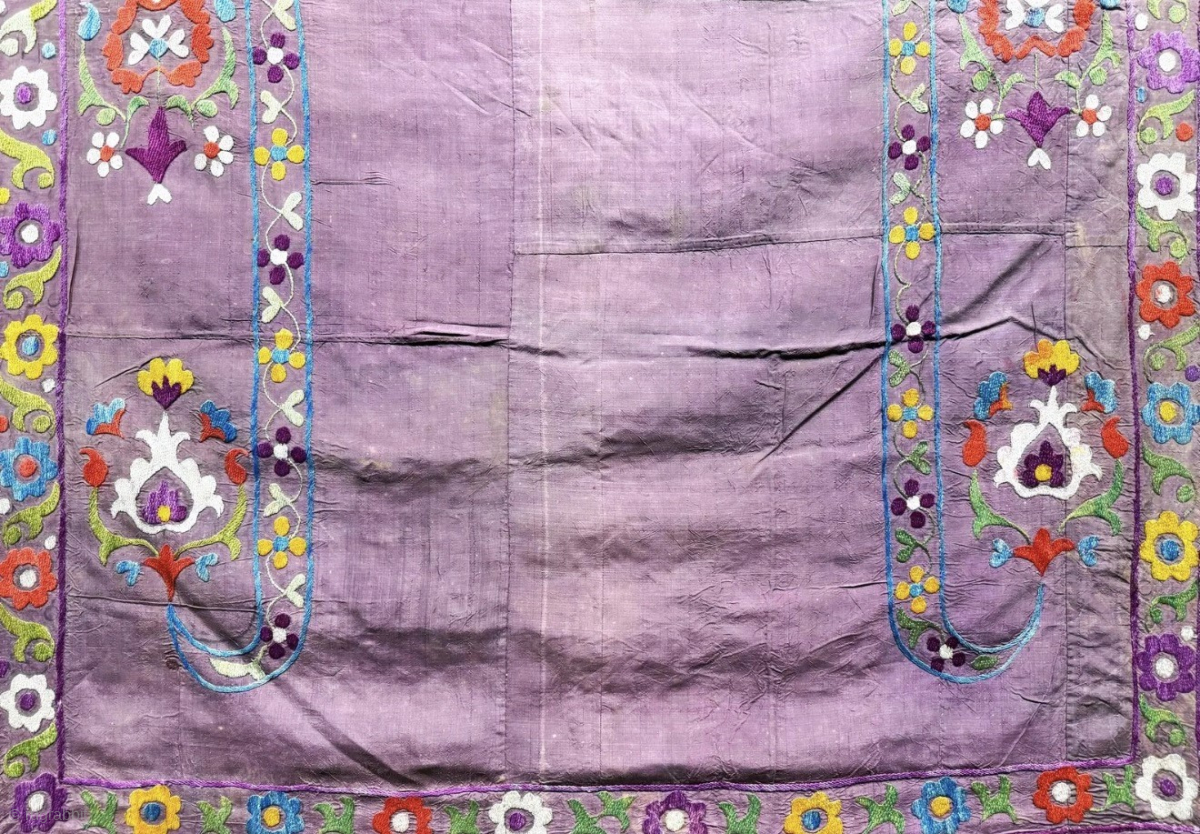 Antique Uzbekistan lakai silk on silk embroidered prayer suzani with traditional and floral design. Size - 51'' x 37'' - ''130 cm x 94 cm'' turkmansilver@gmail.com.