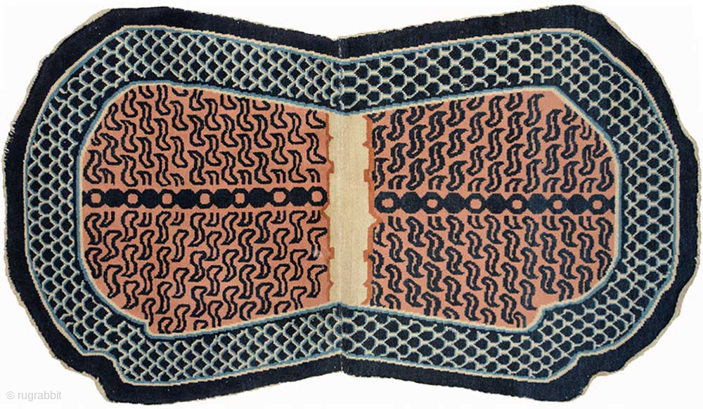 Large tiger striped under-saddle carpet made in the Xinjiang region of western China.The tiger stripes emanate out from a stylised backbone while the main border features dragon scales. Made circa 1930, the size is 143cm x 93cm (approximately 56in x 37in), the warp nd weft are cotton, the colours are good and there are no repairs. More photos can be seen here https://warpandweft.club/portfolio-item/xinjiang-item-2/