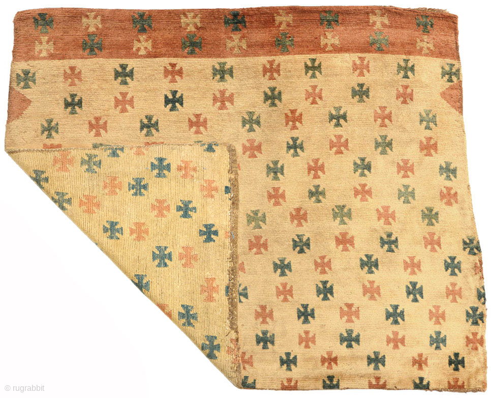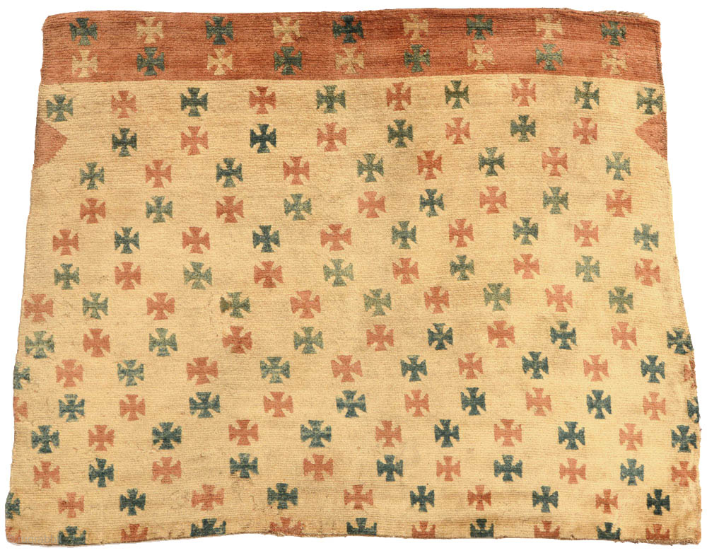 Tibetan woolen cover or ‘blanket’ made for use on a horse or yak with ‘crusader-like-cross’ motifs arrayed in a staggered linear pattern across the face that gives a pleasing fluid movement to the arrangement. Made circa 1900 or possibly before, it has a fleecy woolen pile, the colours are from natural dyes and both the warp and weft are of handspun wool (with what appears to be yak hair in both). The width across the bottom is 140cm, across the top 127cm, and the height is 107cm (approximately 55in x 50in x 42in respectfully) and it has a soft floppy ‘handle. There is a small old reweave, barely discernible from the front side, but overall it is an attractive old takheb in good condition for its age with it’s ostensibly-scattered array of motifs giving it a very pleasant visual appeal. See more photos and information here https://warpandweft.club/portfolio-item/takhebs-item-6/