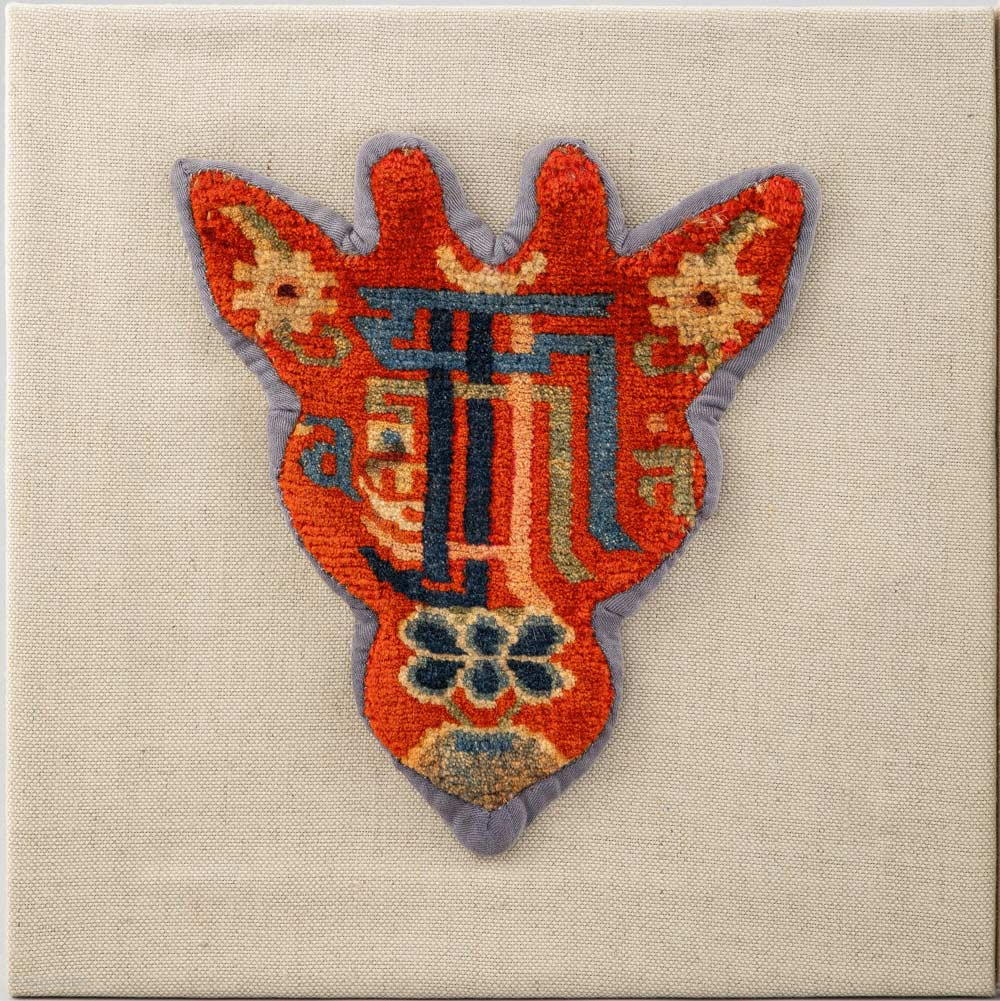 Tibetan takyebs are decorative woolen ornaments, woven for use on horses and pack animals, which are constructed specifically to fit securely on the animal’s forehead. Often the design itself has an additional role as a talisman or ‘good luck charm’, and the design of this particular takyeb fits into that talisman category as it features the sacred Kalachakra symbol set against a red dyed background, arrayed around which are several flowers. Made during the early 1900’s it is tightly woven with both the warp and weft being wool, rich saturated natural dyes, is backed by blue cotton cloth and measures 23cm x 26cm (approximately 9in x 10in). It is professionally mounted on off-white / bone coloured canvas on a wooden frame that measures 37cm x 37cm (14.5in x 14.5in), but this could be easily removed if so desired. An exceptional piece in excellent condition that displays beautifully on a wall with its vibrant colours and symbolic motif remaining prominent. Please see more photos and information here https://warpandweft.club/portfolio-item/tack-item-12/ and more horse tack here https://warpandweft.club/portfolio-item/other-horse-tack/
