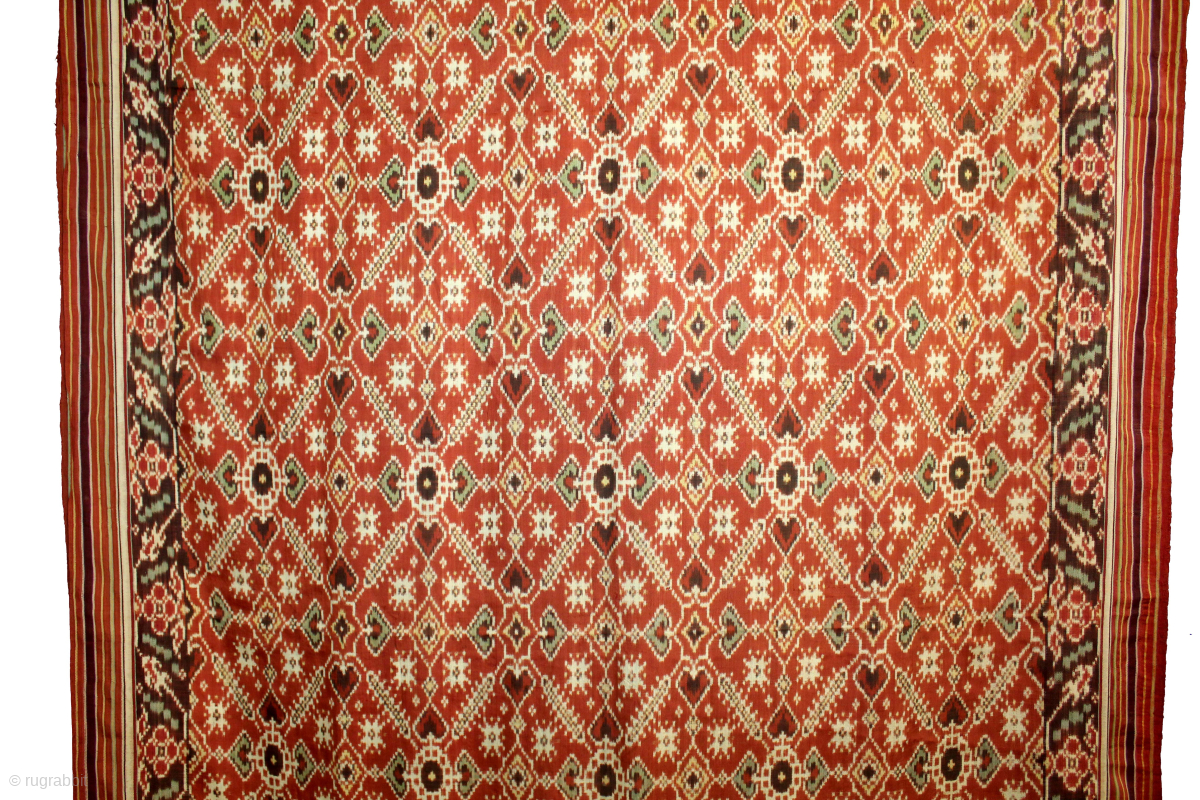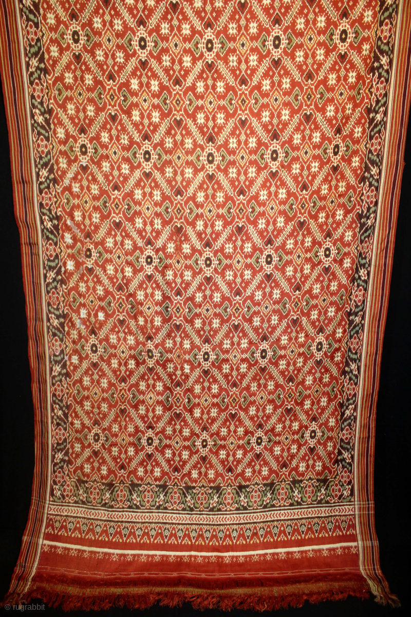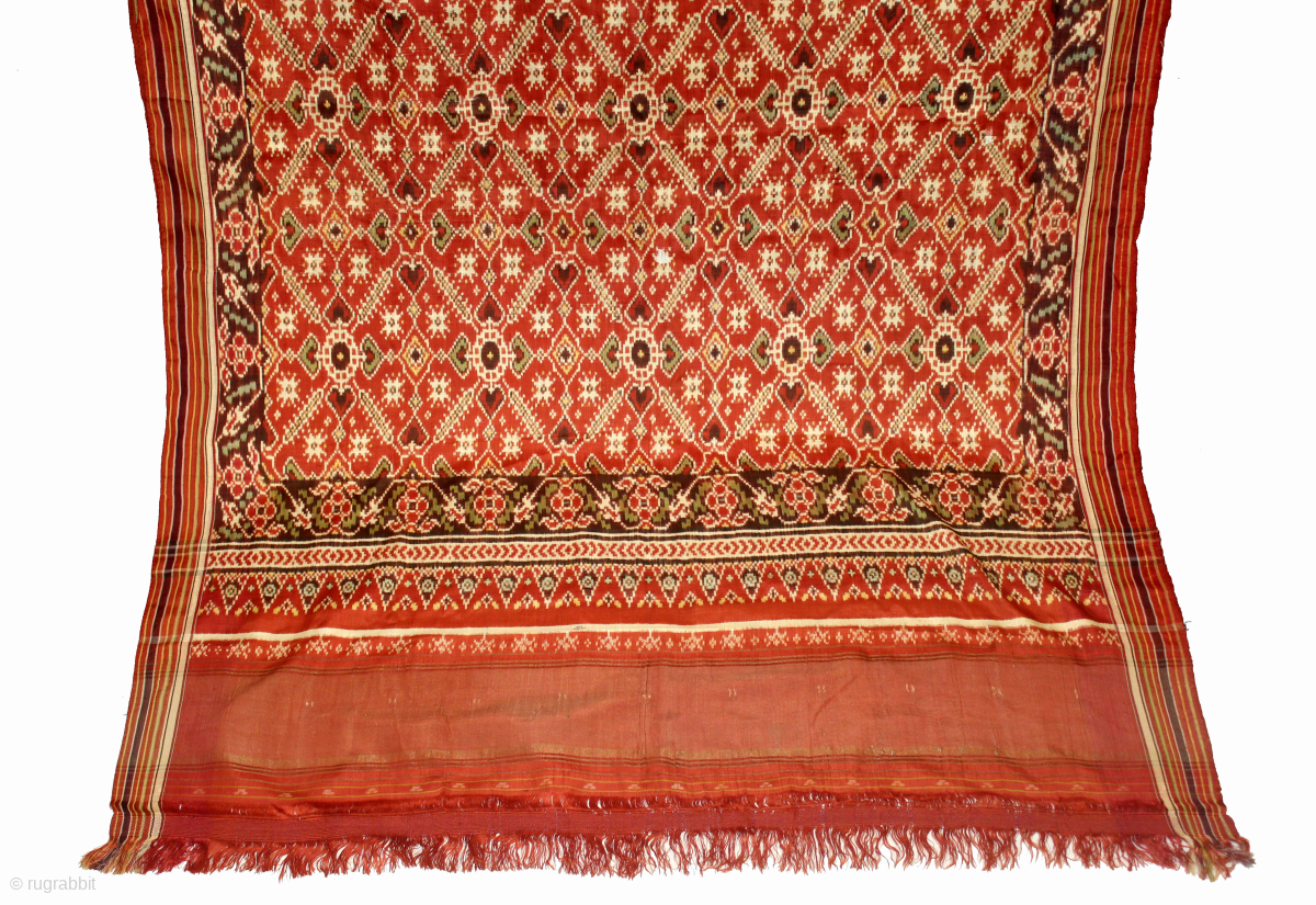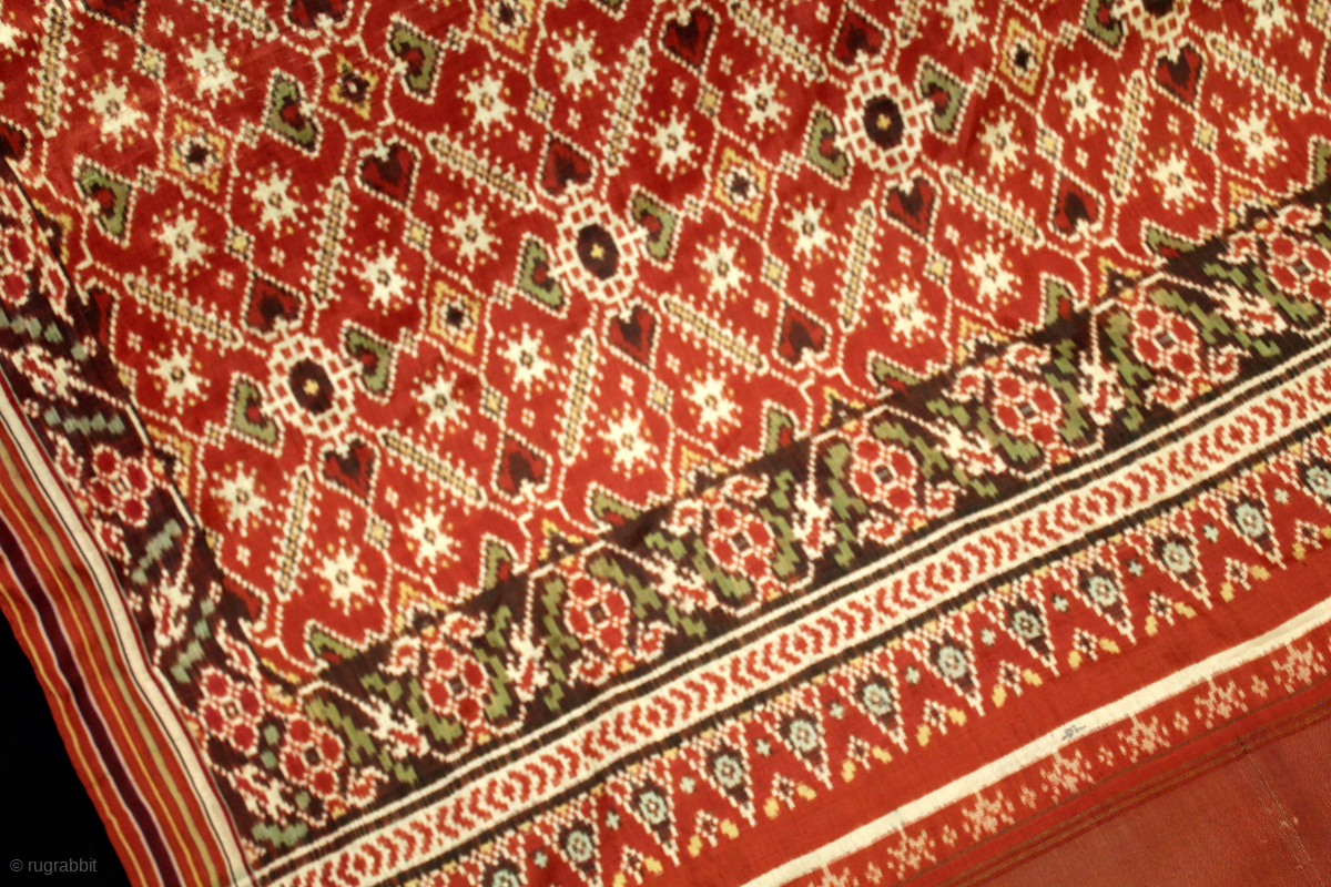 Patola Sari Double Ikat.Woven with Vohra-Gaji-Bhat,Used by the Vohra Muslim Merchant Caste From Patan Gujarat India.This pattern is called “Vohra Gaji Bhat”, a design favored by the Vohra Muslims. Its Size is 118cm x 454cm.(DSL060150).Please email me at indianarts1369@gmail.com