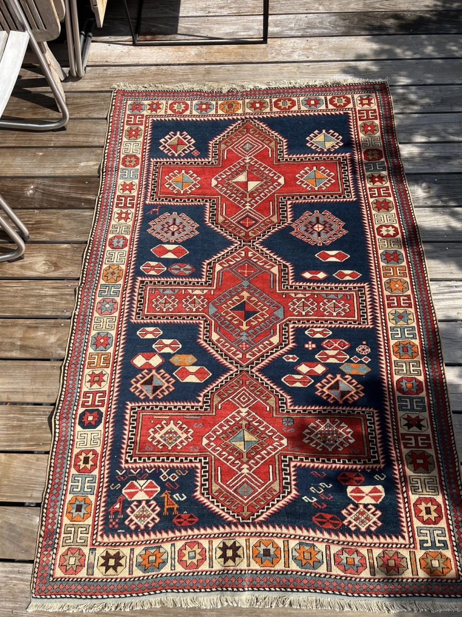 Bold Armenian Kazak rug featuring large cruciform medallions on a deep blue field, stepped geometric forms, and strong architectural borders. Classic village weaving with powerful drawing and balanced proportions.