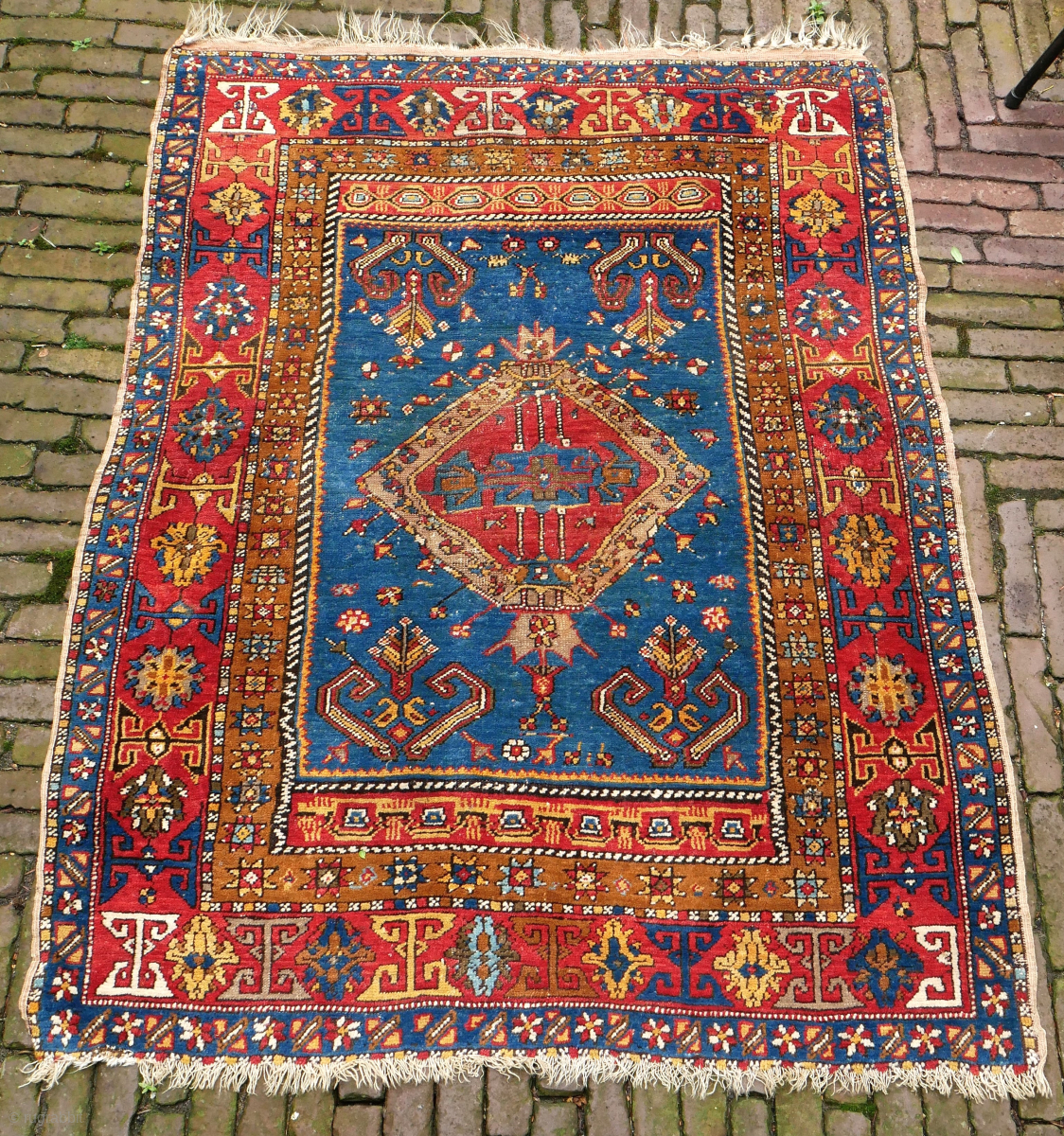 Lovely Yahyali small rug, Anatolia, beautiful colors, with royal blue. Good condition, some corrosion, a strong rug. 111 x 140 cm. please use contact form on www.beamol.