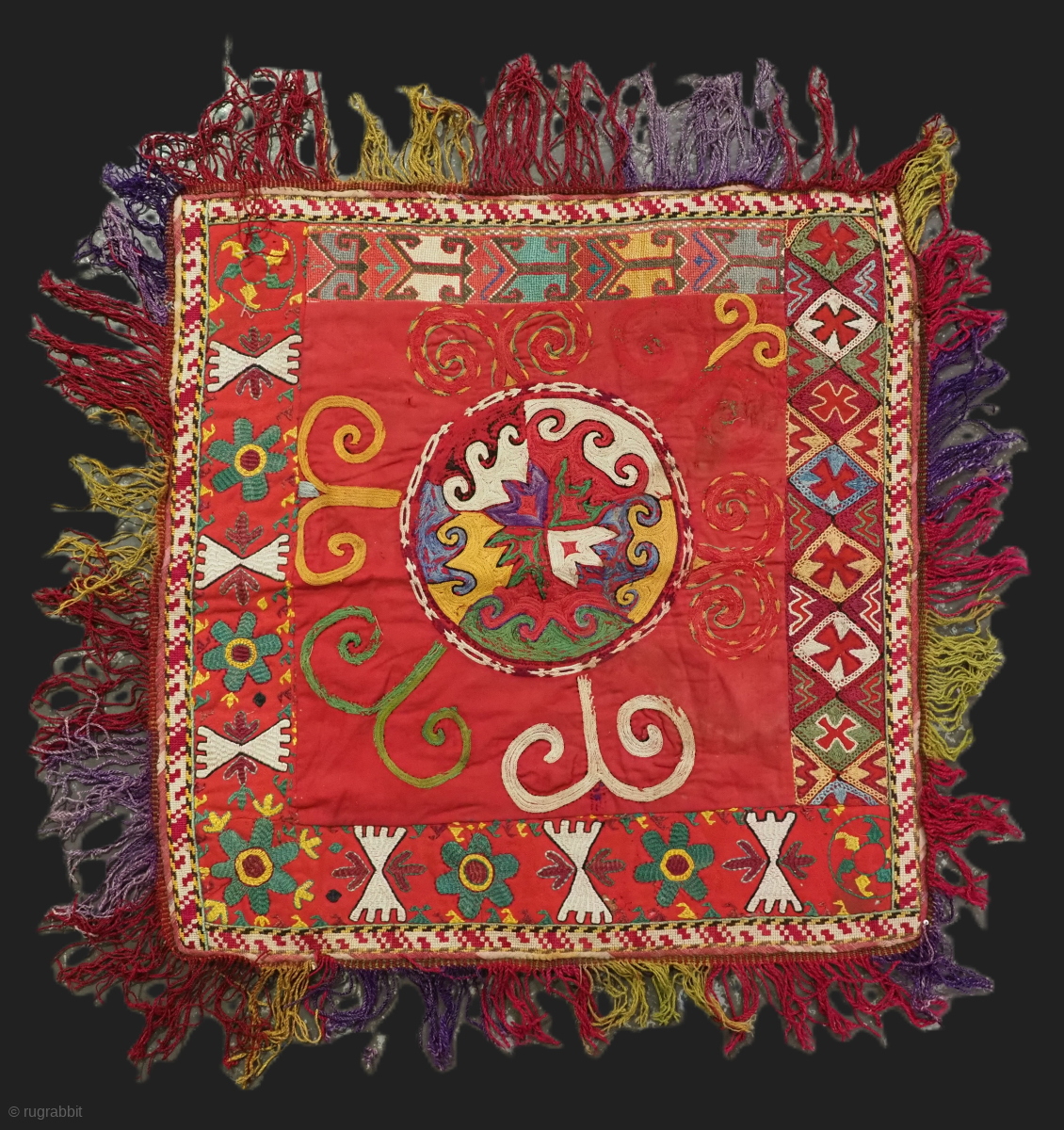 Uzbek ilgich, silk embroidery on Mogul red cotton. Size: 50 x 50cm excluding tassels.