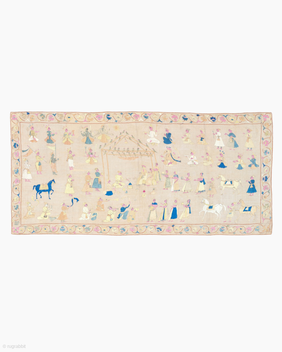 This rare mid 19th century Indian textile highlights a powerful and rhythmic figurative composition featuring a celebratory courtly or wedding scene populated by numerous figures and animals rendered in a delicate, folk-art style. This structural balance between the central canopy—under which key figures are seated—and the rows of standing attendants, musicians, and riders reflects the rich narrative tradition of Indian embroidery. Indian textiles of this period, such as Chamba Rumals or similar regional embroideries, are world-renowned for their pictorial charm and their ability to capture complex social and religious stories through a vibrant, horizontal frieze format.
