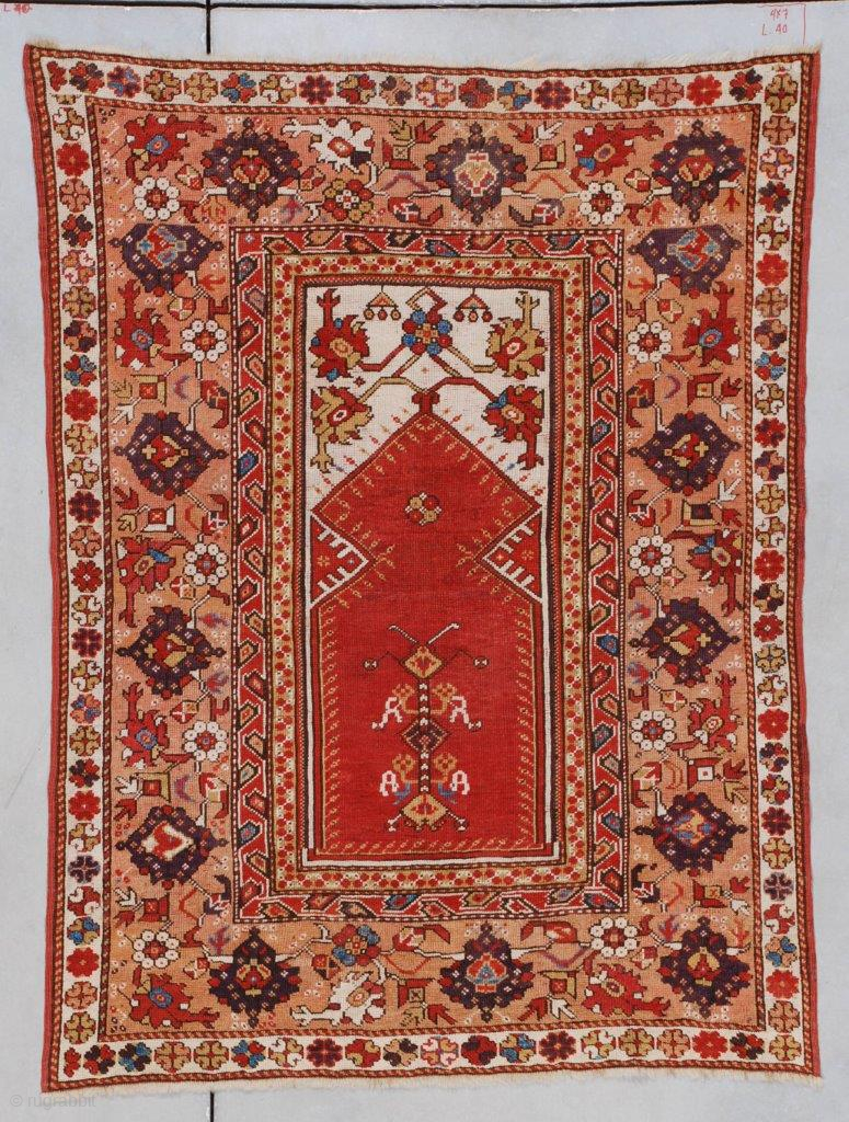 This circa 1825 Melas or Melez antique Oriental carpet measures 3’8” x 4’10”(115 x 152 cm). It has a tomato red prayer niche on an ivory ground with carnation motif in the spandrels. It has two niche amulets. It has a tree of life/dragon motif in the center of the niche. The minor border is a meandering vine with cherry red flower heads. The next border out is a cross between meandering s and a bird motif. It has a major border consisting of large roses in aubergine connected with meandering carnation motif in ivory, red, blue and peach. The center of these rose devices in the border is usually filled with a six to eight pointed star. These centers are very unusual in that they are a ram’s horn motif. All is on a very pale peach ground which is literally alive with scorpion motif in red and white in a very natural rendering. The outer border has rose heads on an ivory ground. Given the rams head motif in the border and the nonexistent border solutions this rug that could be older than circa 1825. It could be pushing 1800. This rug has excellent pile, and the ends and sides are complete. It is clean and ready to go.