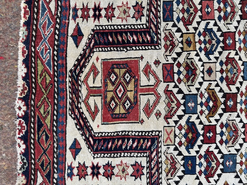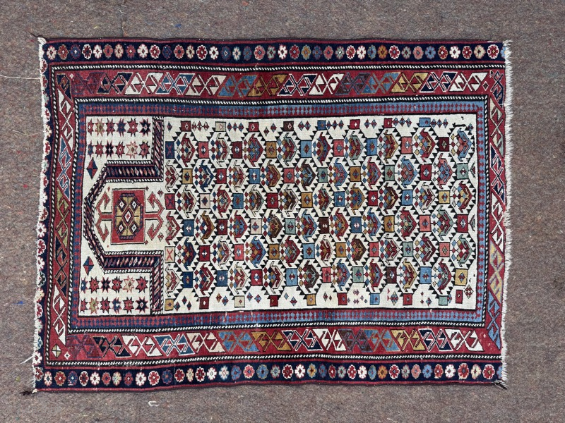 Last quarter 19th century Shirvan prayer rug. Good quality weave, with great saturated colours. Some old repairs, serious losses to top and bottom. 1.15m by 0.87m