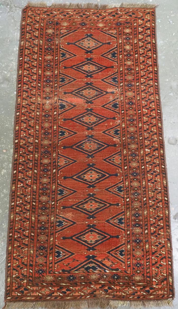 A very interesting rug from the region of northern Afghanistan and the borders of Turkmenistan; the rug has an unusual repeat small medallion design of extended diamond shaped guls, on a orange / red madder ground; the border designs are associated with both Baluch and Ersari Turkmen tribal weavers. The old collectors label attached to the rug attributes it to the 'Taimani Baluch'; although it is probable that the rug is by a Turkmen group related to the Ersari. The rug is without any doubt of some age and a rare design, further study would shed some more light on this rare and small group of Ersari rugs.